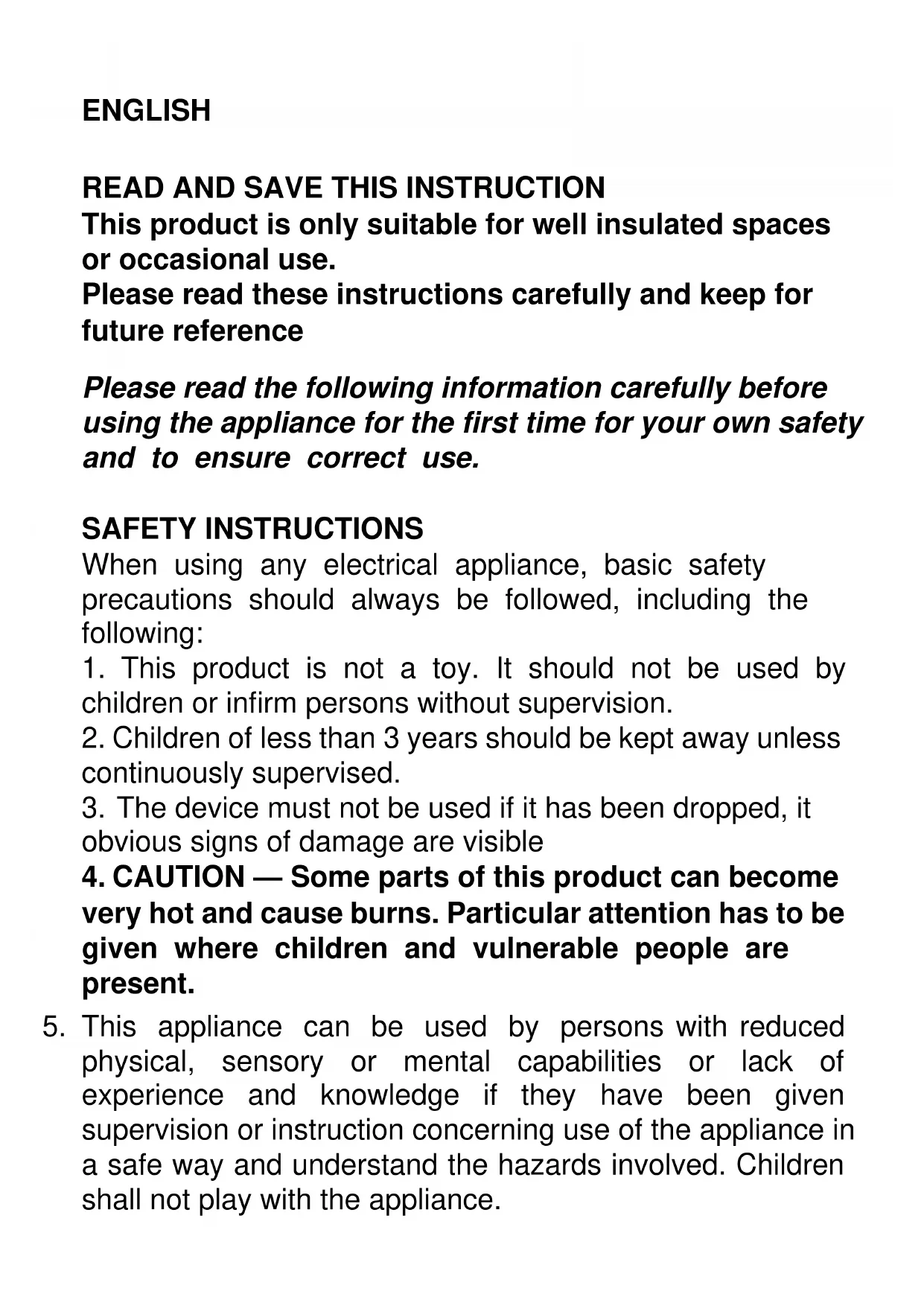 This product is only suitable for well insulated spaces or occasional use. Please read these instructions carefully and keep for future reference Please read the following information carefully before using the appliance for the first time for your own safety and to ensure correct use. SAFETY INSTRUCTIONS When using any electrical appliance, basic safety precautions should always be followed, including the following: