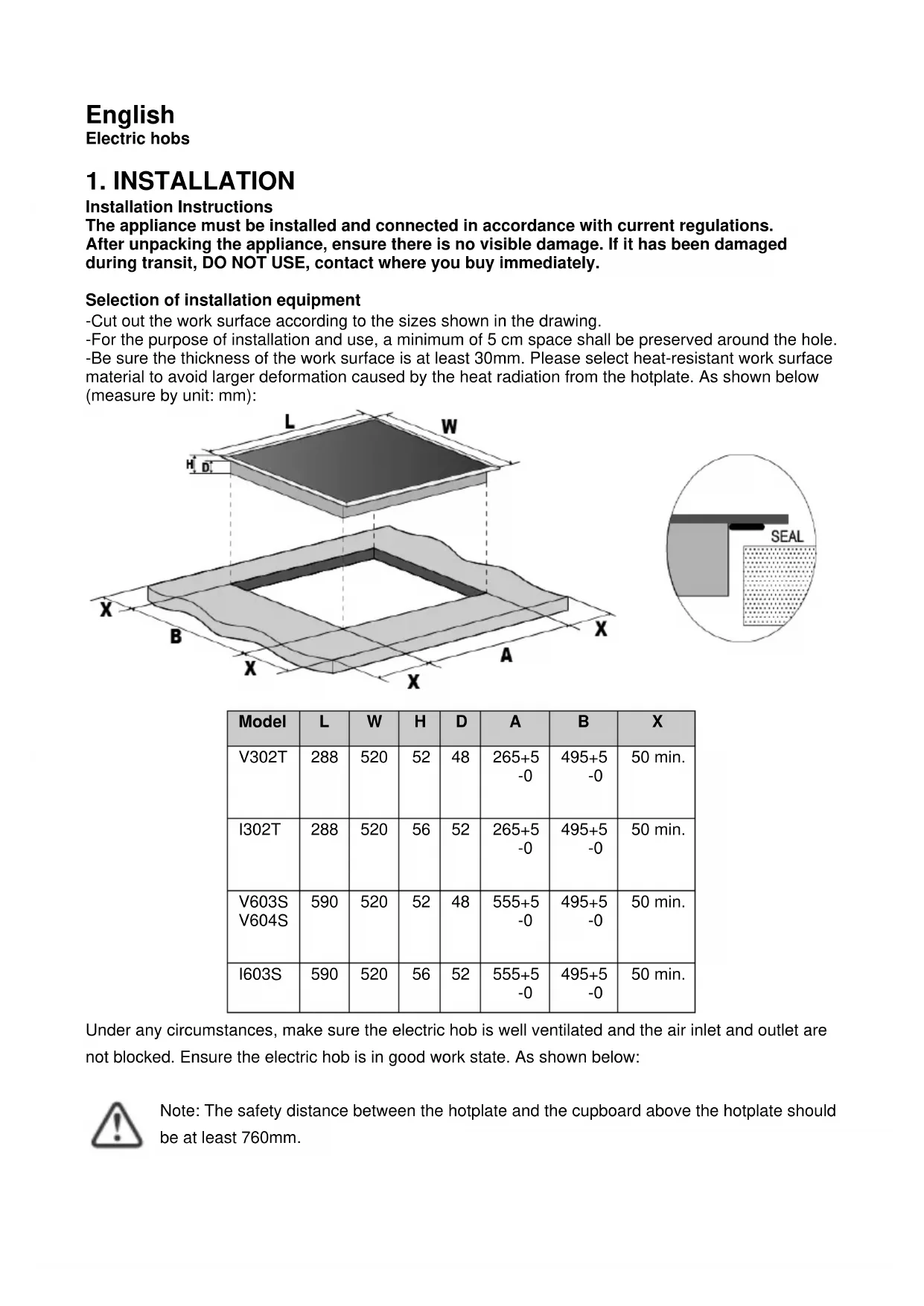 50 min. Under any circumstances, make sure the electric hob is well ventilated and the air inlet and outlet are not blocked. Ensure the electric hob is in good work state. As shown below: Note: The safety distance between the hotplate and the cupboard above the hotplate should be at least 760mm.A(mm) B(mm) C(mm)