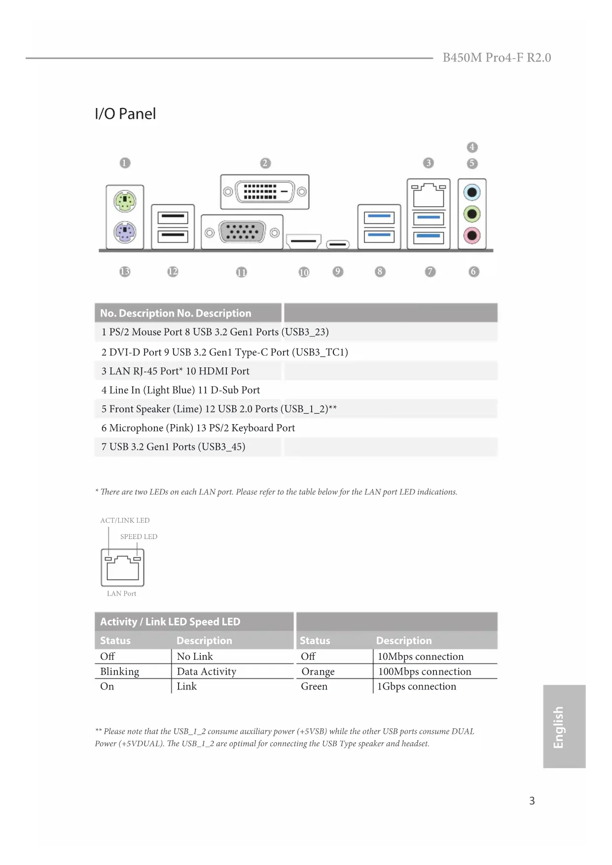 ** Please note that the USB_1_2 consume auxiliary power (+5VSB) while the other USB ports consume DUAL Power (+5VDUAL). e USB_1_2 are optimal for connecting the USB Type speaker and headset.English