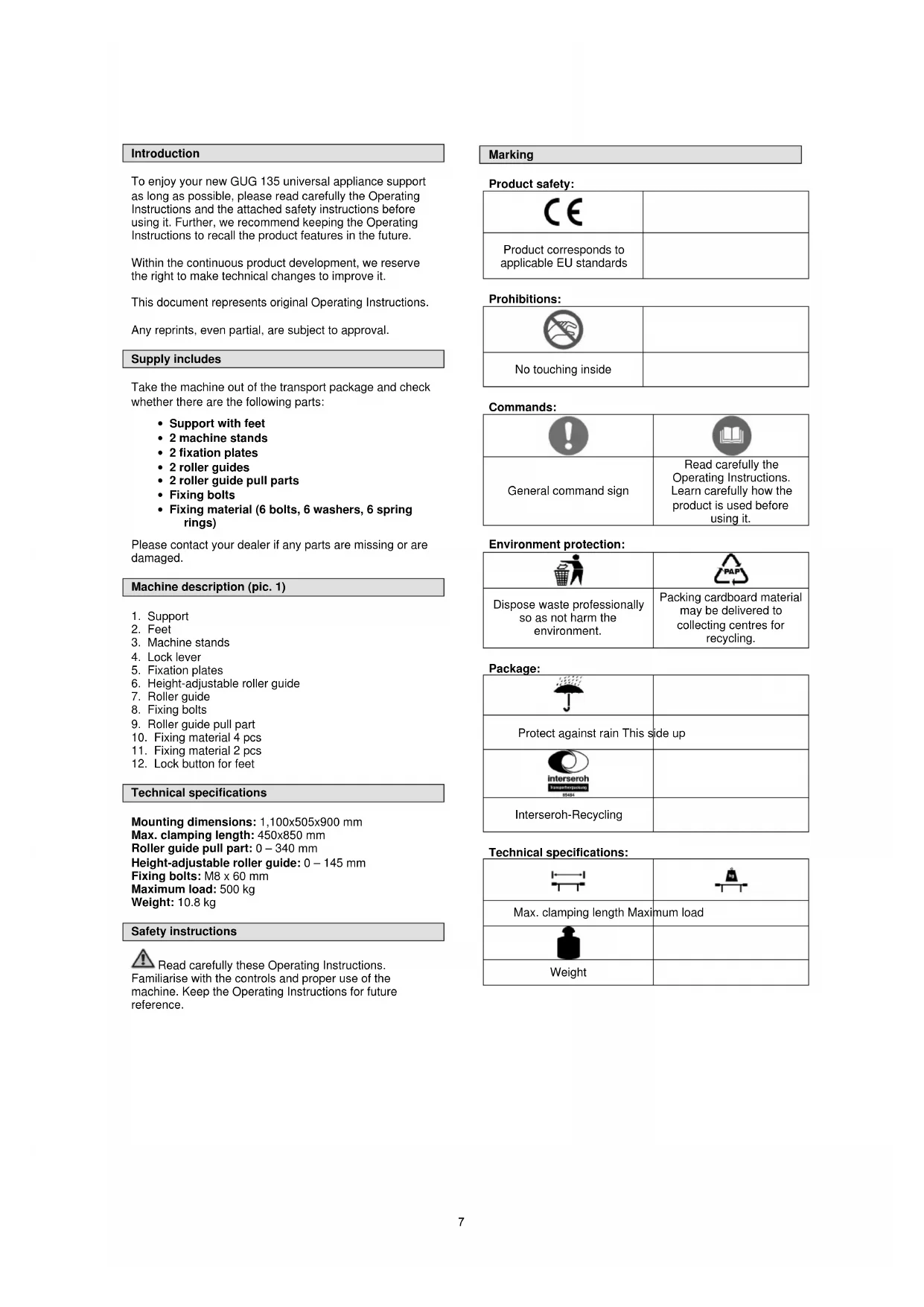 Technical specifications Mounting dimensions: 1,100x505x900 mm Max. clamping length: 450x850 mm Roller guide pull part: 0 – 340 mm Height-adjustable roller guide: 0 – 145 mm Fixing bolts: M8 x 60 mm Maximum load: 500 kg Weight: 10.8 kg Safety instructions Read carefully these Operating Instructions. Familiarise with the controls and proper use of the machine. Keep the Operating Instructions for future reference. Marking Product safety: Product corresponds to applicable EU standards Prohibitions: No touching inside Commands: General command sign Read carefully the Operating Instructions. Learn carefully how the product is used before using it. Environment protection: Dispose waste professionally so as not harm the environment. Packing cardboard material may be delivered to collecting centres for recycling. Package: Protect against rain This side up Interseroh-Recycling Technical specifications: Max. clamping length Maximum load Weight 7Training Please read carefully the Operating and servicing instructions. Familiarise thoroughly with the controls and proper use of the machine. You must know how the machine works and how to switch the controls immediately off. Never let children work with the machine. Never let adults work with the machine if not trained properly. Do not let any persons, especially small children and pets, to the place of your work. Be careful to prevent any slipping or falling down. Use as designated The universal appliance support has exclusively been designed to clamp electric appliances/machines that can be safely and reliably fixed to the machine stands. The user is responsible for reliable fixing. The machine cannot be used for works other than for which the machine has been designed and that are specified in the Operating Instructions. Any other use is a use in conflict with the designation. The manufacturer will not be liable for any consequential damage and injuries. Please be sure to know that the machine has not been designed for industrial purposes. Assembly Fitting to the support (pic. 2-4)