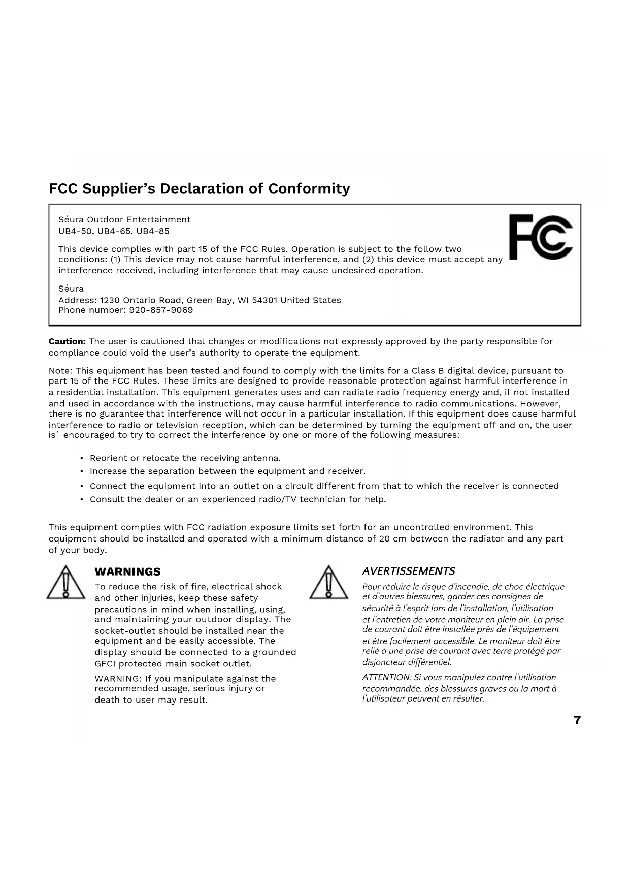 recommended usage, serious injury or death to user may result. AVERTISSEMENTS Pour réduire le risque d’incendie, de choc électrique et d’autres blessures, garder ces consignes de sécurité à l’esprit lors de l’installation, l’utilisation et l’entretien de votre moniteur en plein air. La prise de courant doit être installée près de l’équipement et être facilement accessible. Le moniteur doit être relié à une prise de courant avec terre protégé par disjoncteur différentiel. ATTENTION: Si vous manipulez contre l’utilisation recommandée, des blessures graves ou la mort à l’utilisateur peuvent en résulter. FCC Supplier’s Declaration of Conformity Séura Outdoor Entertainment UB4-50, UB4-65, UB4-85 This device complies with part 15 of the FCC Rules. Operation is subject to the follow two conditions: (1) This device may not cause harmful interference, and (2) this device must accept any interference received, including interference that may cause undesired operation. Séura Address: 1230 Ontario Road, Green Bay, WI 54301 United States Phone number: 920-857-9069 This equipment complies with FCC radiation exposure limits set forth for an uncontrolled environment. This equipment should be installed and operated with a minimum distance of 20 cm between the radiator and any part of your body.