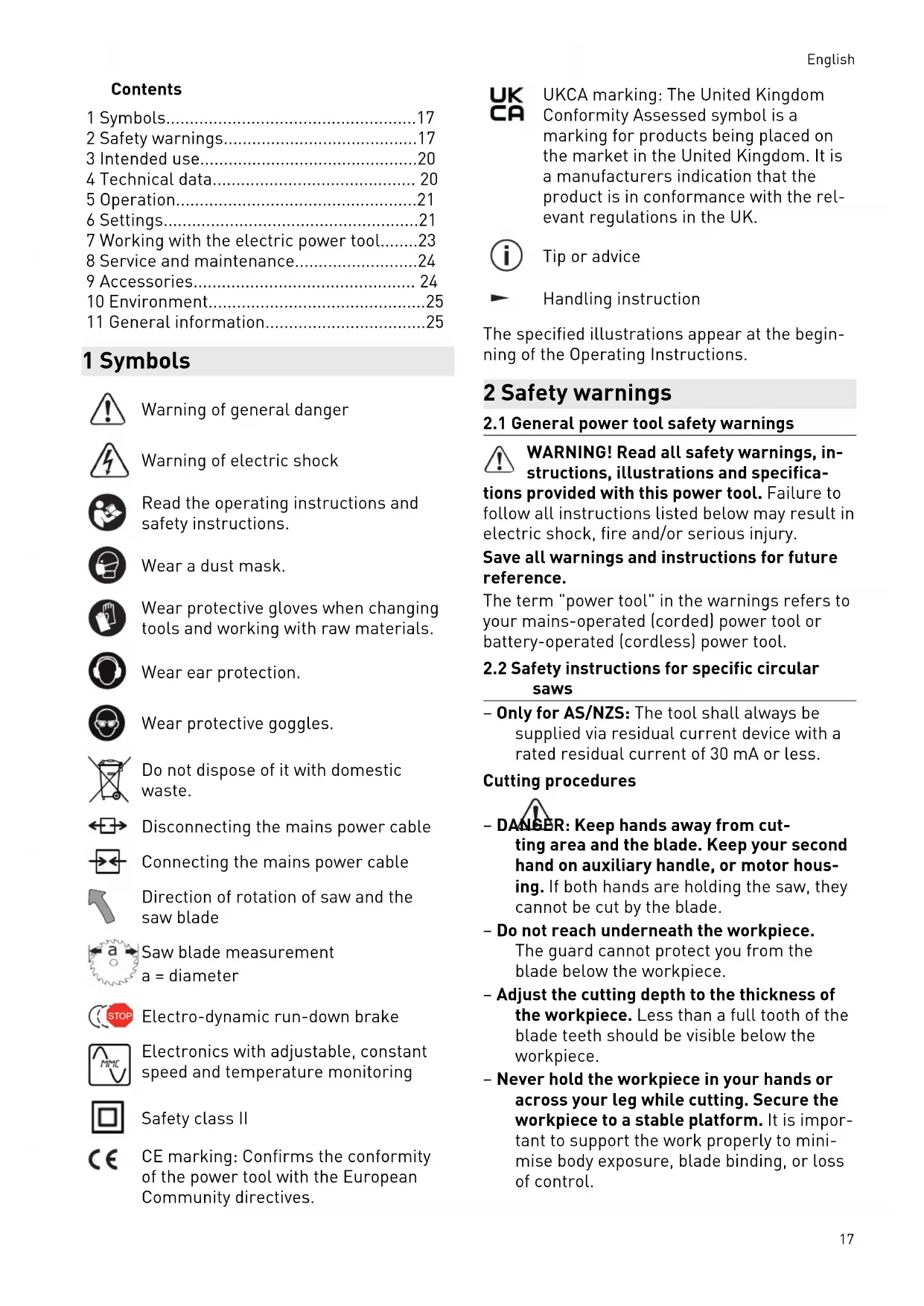 saws – Only for AS/NZS: The tool shall always be supplied via residual current device with a rated residual current of 30 mA or less. Cutting procedures – DANGER: Keep hands away from cut ting area and the blade. Keep your second hand on auxiliary handle, or motor hous ing. If both hands are holding the saw, they cannot be cut by the blade. – Do not reach underneath the workpiece. The guard cannot protect you from the blade below the workpiece. – Adjust the cutting depth to the thickness of the workpiece. Less than a full tooth of the blade teeth should be visible below the workpiece. – Never hold the workpiece in your hands or across your leg while cutting. Secure the workpiece to a stable platform. It is impor tant to support the work properly to mini mise body exposure, blade binding, or loss of control. English 17– Hold the power tool by the insulated han dle surfaces if you intend to perform work that entails a risk of cutting into hidden power cables or the tool's own power ca ble. Contact with live cables transfers an electric current to metal components on the electric power tool and causes electric shocks. – When ripping, always use a rip fence or straight edge guide. This improves the ac curacy of cut and reduces the chance of blade binding. – Always use blades with correct size and shape (diamond versus round) of arbour holes. Blades that do not match the mount ing hardware of the saw will run off-centre, causing loss of control. – Never use damaged or incorrect blade washers or bolt. The blade washers and bolt were specially designed for your saw, for optimum performance and safety of op eration. Kickback causes and related warnings – kickback is a sudden reaction to a pinched, jammed or misaligned saw blade, causing an uncontrolled saw to lift up and out of the workpiece toward the operator; – when the blade is pinched or jammed tight ly by the kerf closing down, the blade stalls and the motor reaction drives the unit rap idly back toward the operator; – if the blade becomes twisted or misaligned in the cut, the teeth at the back edge of the blade can dig into the top surface of the wood causing the blade to climb out of the kerf and jump back toward the operator. Kickback is the result of saw misuse and/or in correct operating procedures or conditions and can be avoided by taking proper precautions as given below. – Maintain a firm grip with both hands on the saw and position your arms to resist kickback forces. Position your body to ei ther side of the blade, but not in line with the blade. Kickback could cause the saw to jump backwards, but kickback forces can be controlled by the operator, if proper pre cautions are taken. – When blade is binding, or when interrupt ing a cut for any reason, release the trig ger and hold the saw motionless in the material until the blade comes to a com plete stop. Never attempt to remove the saw from the work or pull the saw back ward while the blade is in motion or kick back may occur. Investigate and take cor rective actions to eliminate the cause of blade binding. – When restarting a saw in the workpiece, centre the saw blade in the kerf so that the saw teeth are not engaged into the material. If a saw blade binds, it may walk up or kickback from the workpiece as the saw is restarted. – Support large panels to minimise the risk of blade pinching and kickback. Large pan els tend to sag under their own weight. Supports must be placed under the panel on both sides, near the line of cut and near the edge of the panel. – Do not use dull or damaged blades. Un sharpened or improperly set blades pro duce narrow kerf causing excessive fric tion, blade binding and kickback. – Blade depth and bevel adjusting locking levers must be tight and secure before making the cut. If blade adjustment shifts while cutting, it may cause binding and kickback. – Use extra caution when sawing into exist ing walls or other blind areas. The pro truding blade may cut objects that can cause kickback. Lower guard function – Check the lower guard for proper closing before each use. Do not operate the saw if the lower guard does not move freely and close instantly. Never clamp or tie the lower guard into the open position. If the saw is accidentally dropped, the lower guard may be bent. Raise the lower guard with the retracting handle and make sure it moves freely and does not touch the blade or any other part, in all angles and depths of cut. – Check the operation and condition of the guard return spring. If the guard and the spring are not operating properly, they must be serviced before use. The guard may operate sluggishly due to damaged parts, gummy deposits, or a build-up of debris. – Assure that the base plate of the saw will not shift while performing a "plunge cut". Blade shifting sideways will cause binding and likely kick back. English 18– Always observe that the guard is covering the blade before placing the saw down on bench or floor. An unprotected, coasting blade will cause the saw to walk back wards, cutting whatever is in its path. Be aware of the time it takes for the blade to stop after the switch is released. Riving knife function – Use the appropriate saw blade for the riv ing knife. For the riving knife to function, the body of the blade must be thinner than the riving knife and the cutting width of the blade must be wider than the thickness of the riving knife. – Adjust the riving knife as described in this instruction manual. Incorrect spacing,posi tioning and alignment can make the riving knife ineffective in preventing kickback. – For the riving knife to work, it must be en gaged in the workpiece. The riving knife is ineffective in preventing kickback during short cuts. – Do not operate the saw if the spacer wedge is bent. Even the slightest problem can cause the guard to close more slowly.