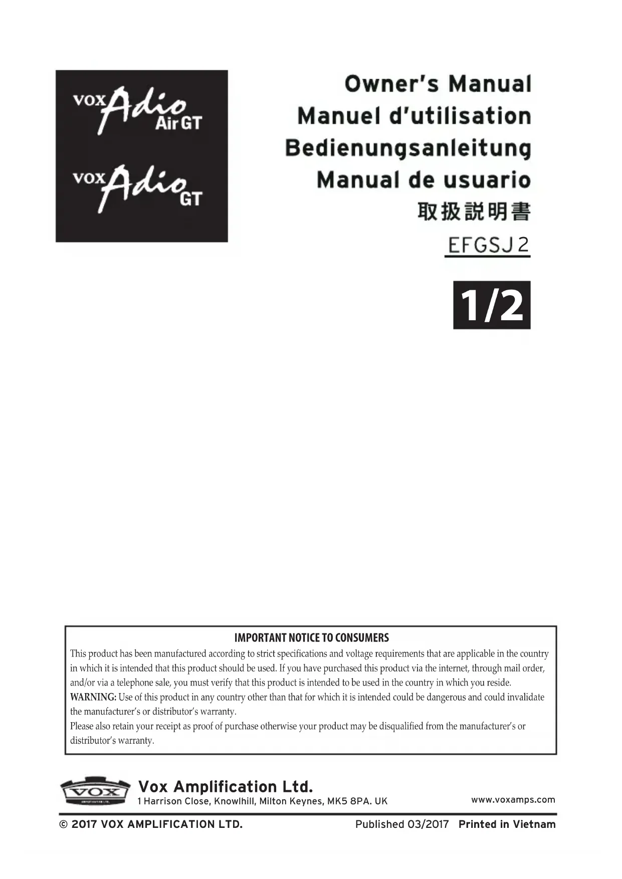 Vox Amplification Ltd. 1/2 Published 03/2017 Printed in Vietnam