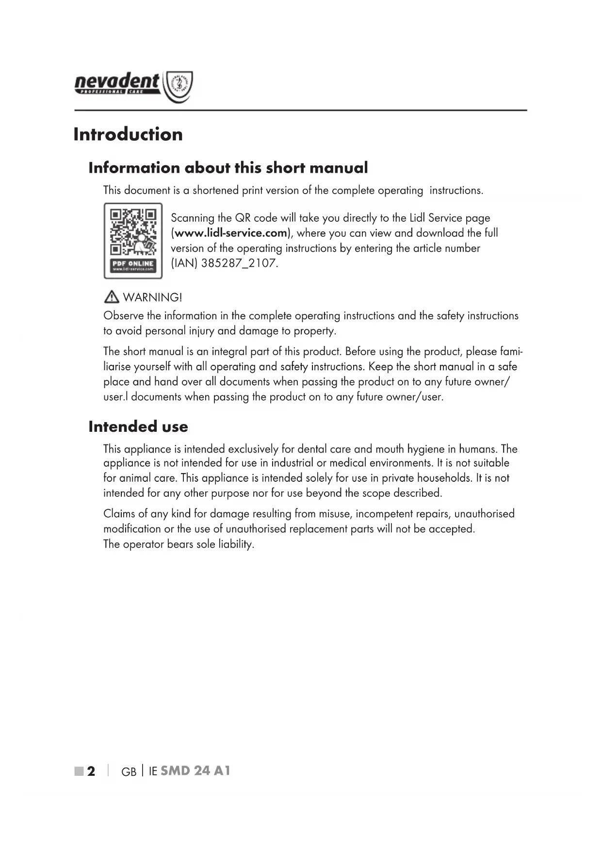 Introduction Information about this short manual This document is a shortened print version of the complete operating instructions. Scanning the QR code will take you directly to the Lidl Service page (www.lidl-service.com), where you can view and download the full version of the operating instructions by entering the article number (IAN) 385287_2107. WARNING! Observe the information in the complete operating instructions and the safety instructions to avoid personal injury and damage to property. The short manual is an integral part of this product. Before using the product, please fami- liarise yourself with all operating and safety instructions. Keep the short manual in a safe place and hand over all documents when passing the product on to any future owner/ user.l documents when passing the product on to any future owner/user. Intended use This appliance is intended exclusively for dental care and mouth hygiene in humans. The appliance is not intended for use in industrial or medical environments. It is not suitable for animal care. This appliance is intended solely for use in private households. It is not intended for any other purpose nor for use beyond the scope described. Claims of any kind for damage resulting from misuse, incompetent repairs, unauthorised modification or the use of unauthorised replacement parts will not be accepted. The operator bears sole liability. IB_385287_SMD24A1_LB8-short.indb 2IB_385287_SMD24A1_LB8-short.indb 2 27.10.2021 11:36:2727.10.2021 11:36:27GB