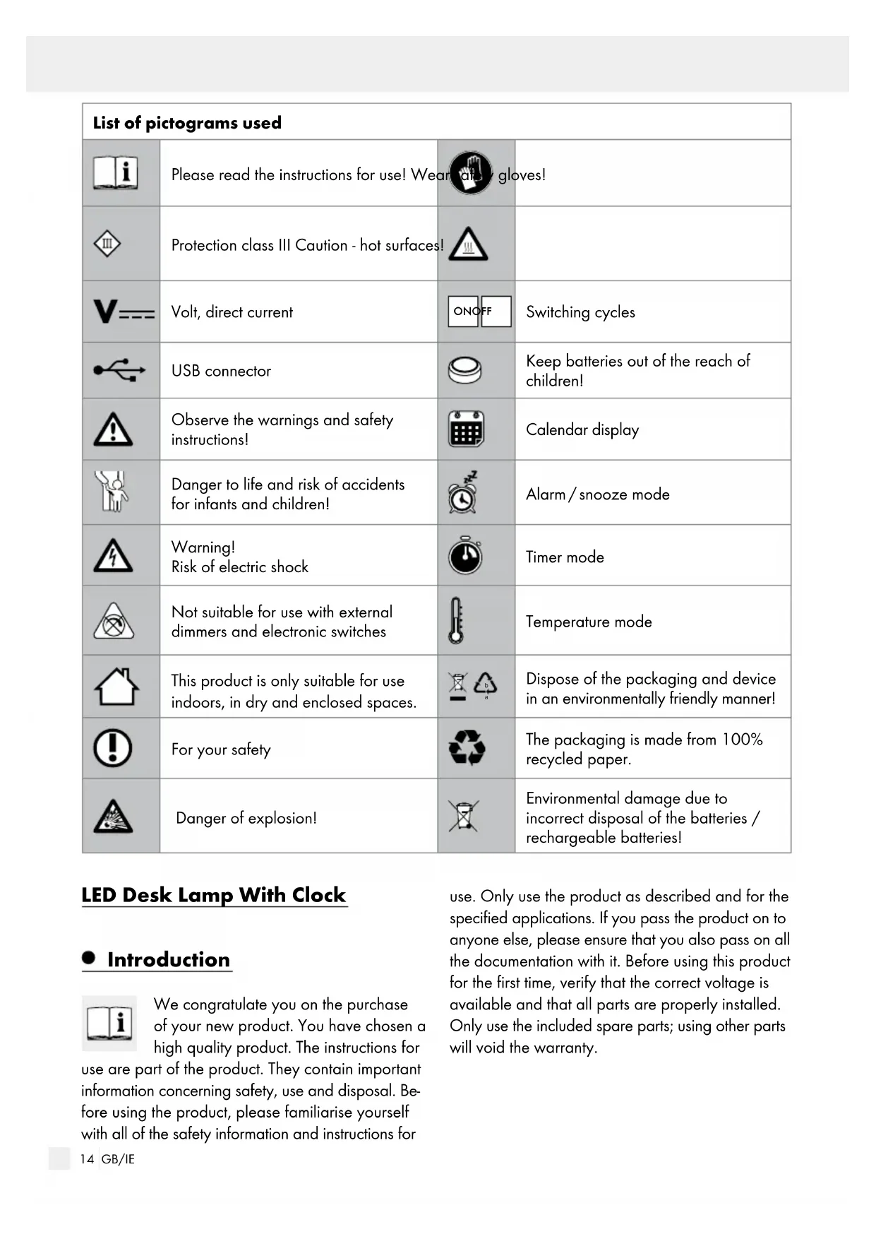 Dispose of the packaging and device in an environmentally friendly manner! For your safety The packaging is made from 100% recycled paper. Danger of explosion! Environmental damage due to incorrect disposal of the batteries / rechargeable batteries! LED Desk Lamp With Clock Introduction We congratulate you on the purchase of your new product. You have chosen a high quality product. The instructions for use are part of the product. They contain important information concerning safety, use and disposal. Be- fore using the product, please familiarise yourself with all of the safety information and instructions for use. Only use the product as described and for the specified applications. If you pass the product on to anyone else, please ensure that you also pass on all the documentation with it. Before using this product for the first time, verify that the correct voltage is available and that all parts are properly installed. Only use the included spare parts; using other parts will void the warranty.15 GB/IE Introduction / Safety Intended use This product is only suitable for use indoors, in dry and enclosed spaces. This device is intended for private household use only. This product is not suitable for use as room lighting or as a nightlight. Delivery contents Check that all the parts are present and that the device is in perfect condition immediately after unpacking. 1 LED Desk Lamp With Clock 14137006L / 14137005L 1 Micro-USB cable 1 Button cell battery, type CR2032 1 Set of instructions for use Parts description