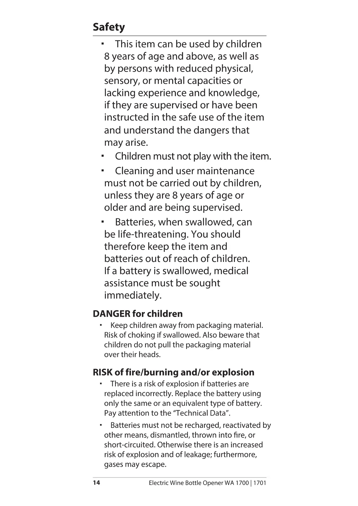 - Disposal Weinoeffner WA 1700_1701.indb 13 04.05.2017 13:06:5514 Electric Wine Bottle Opener WA 1700 | 1701 Safety This item can be used by children 8 years of age and above, as well as by persons with reduced physical, sensory, or mental capacities or lacking experience and knowledge, if they are supervised or have been instructed in the safe use of the item and understand the dangers that may arise. Children must not play with the item. Cleaning and user maintenance must not be carried out by children, unless they are 8 years of age or older and are being supervised. Batteries, when swallowed, can be life-threatening. You should therefore keep the item and batteries out of reach of children. If a battery is swallowed, medical assistance must be sought immediately. DANGER for children Keep children away from packaging material. Risk of choking if swallowed. Also beware that children do not pull the packaging material over their heads. RISK of fire/burning and/or explosion There is a risk of explosion if batteries are replaced incorrectly. Replace the battery using only the same or an equivalent type of battery. Pay attention to the “Technical Data”. Batteries must not be recharged, reactivated by other means, dismantled, thrown into re, or short-circuited. Otherwise there is an increased risk of explosion and of leakage; furthermore, gases may escape. Weinoeffner WA 1700_1701.indb 14 04.05.2017 13:06:55Electric Wine Bottle Opener WA 1700 | 1701 p. 21