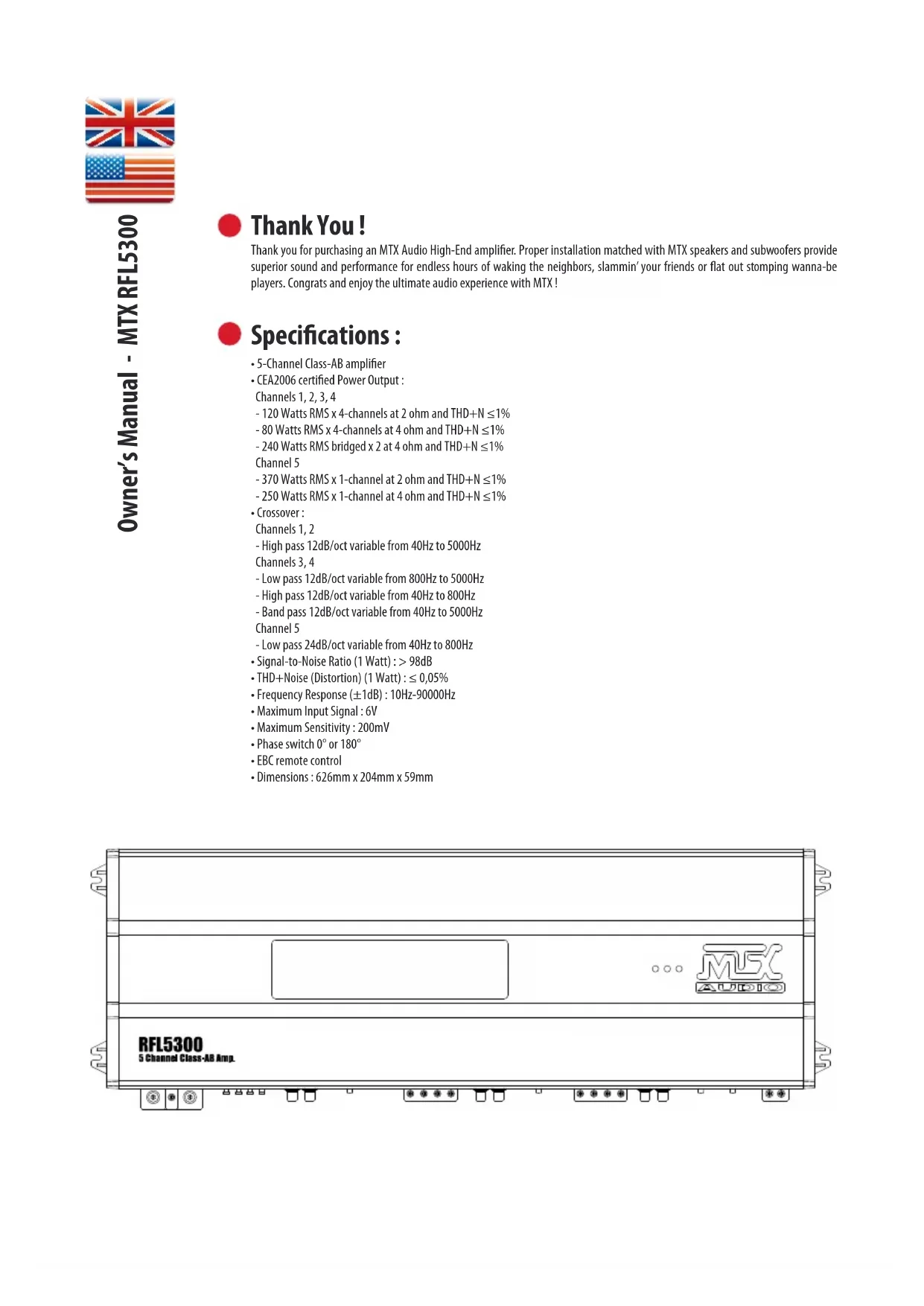 mtxaudio.eu RFL5300 5 Channel Class-AB Power Amplifier 850W RMS CEAOwner’s Manual - MTX RFL5300 Thank You ! Thank you for purchasing an MTX Audio High-End amplifier. Proper installation matched with MTX speakers and subwoofers provide superior sound and performance for endless hours of waking the neighbors, slammin’ your friends or flat out stomping wanna-be players. Congrats and enjoy the ultimate audio experience with MTX ! Specifications :