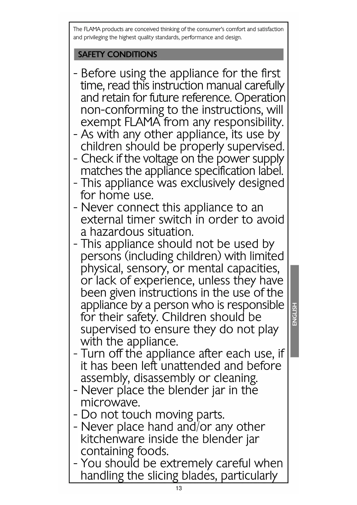 and privileging the highest qualit y standards, performance and design. SAFETY CONDITIONS - Before using the appliance for the first time, read this instruction manual carefully and retain for future reference. Operation non-conforming to the instructions, will exempt FLAMA from any responsibility. - As with any other appliance, its use by children should be properly supervised. - Check if the voltage on the power supply matches the appliance specification label. - This appliance was exclusively designed for home use. - Never connect this appliance to an external timer switch in order to avoid a hazardous situation. - This appliance should not be used by persons (including children) with limited physical, sensory, or mental capacities, or lack of experience, unless they have been given instructions in the use of the appliance by a person who is responsible for their safety. Children should be supervised to ensure they do not play with the appliance. - Turn off the appliance after each use, if it has been left unattended and before assembly, disassembly or cleaning. - Never place the blender jar in the microwave. - Do not touch moving parts. - Never place hand and/or any other kitchenware inside the blender jar containing foods. - You should be extremely careful when handling the slicing blades, particularly