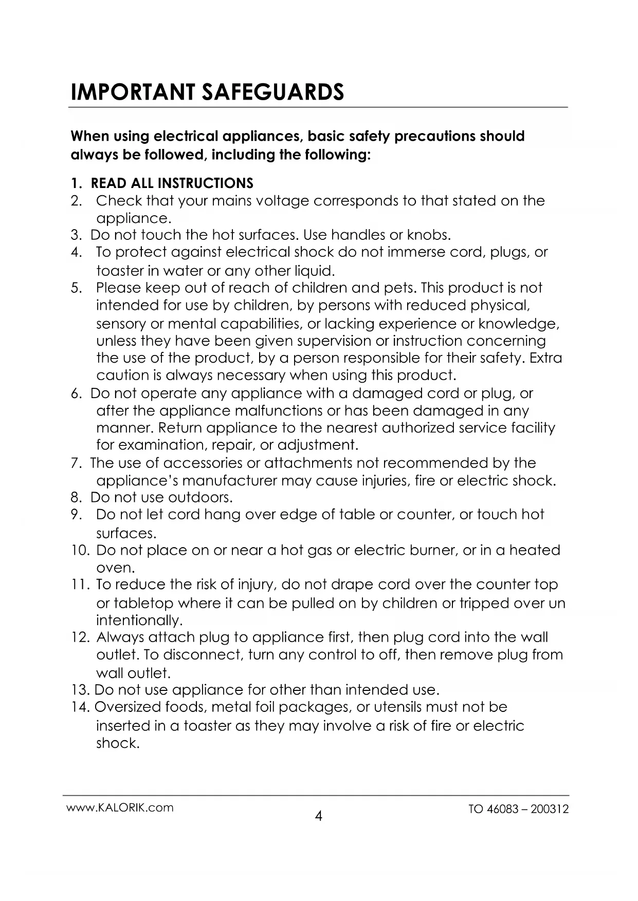 www.KALORIK.com TO 46083 – 200312 IMPORTANT SAFEGUARDS When using electrical appliances, basic safety precautions should always be followed, including the following: