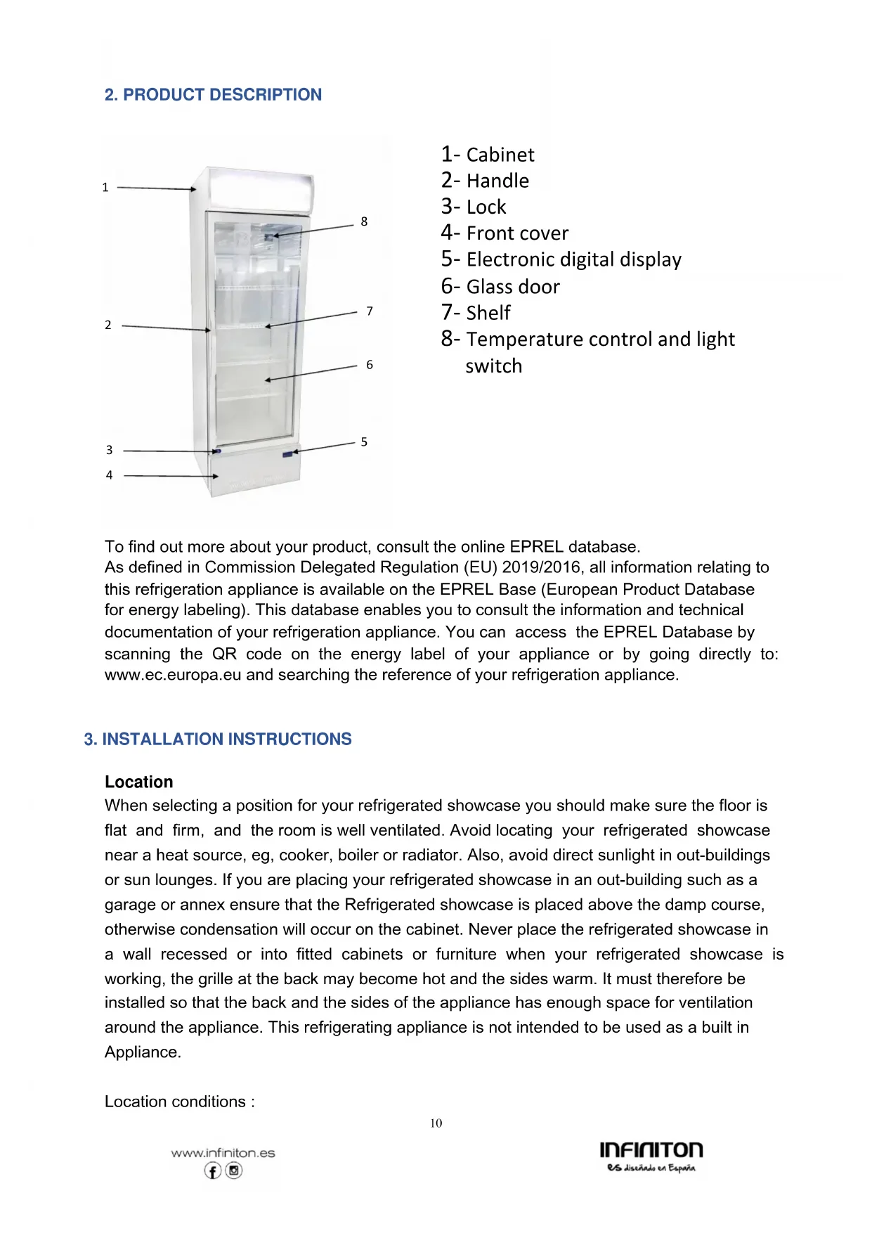 To find out more about your product, consult the online EPREL database. As defined in Commission Delegated Regulation (EU) 2019/2016, all information relating to this refrigeration appliance is available on the EPREL Base (European Product Database for energy labeling). This database enables you to consult the information and technical documentation of your refrigeration appliance. You can access the EPREL Database by scanning the QR code on the energy label of your appliance or by going directly to: www.ec.europa.eu and searching the reference of your refrigeration appliance.