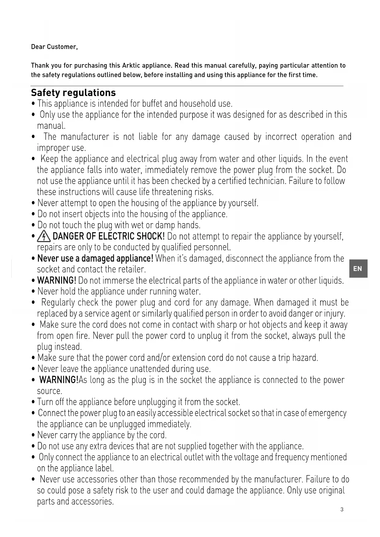 Dear Customer, Thank you for purchasing this Arktic appliance. Read this manual carefully, paying particular attention to the safety regulations outlined below, before installing and using this appliance for the first time. Safety regulations