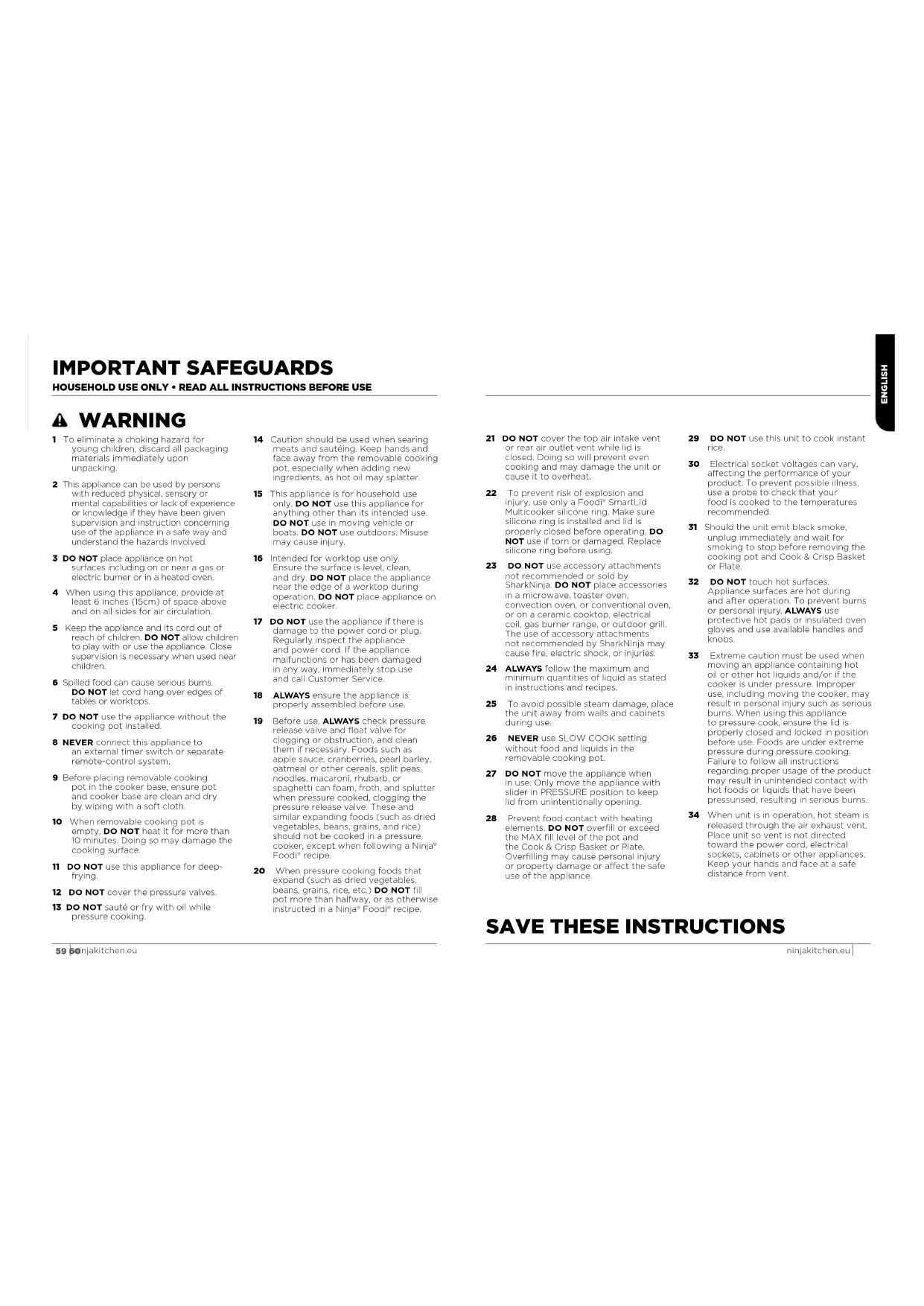 WARNING 1 To eliminate a choking hazard for young children, discard all packaging materials immediately upon unpacking. 2 This appliance can be used by persons with reduced physical, sensory or mental capabilities or lack of experience or knowledge if they have been given supervision and instruction concerning use of the appliance in a safe way and understand the hazards involved. 3 DO NOT place appliance on hot surfaces including on or near a gas or electric burner or in a heated oven. 4 When using this appliance, provide at least 6 inches (15cm) of space above and on all sides for air circulation. 5 Keep the appliance and its cord out of reach of children. DO NOT allow children to play with or use the appliance. Close supervision is necessary when used near children. 6 Spilled food can cause serious burns. DO NOT let cord hang over edges of tables or worktops. 7 DO NOT use the appliance without the cooking pot installed. 8 NEVER connect this appliance to an external timer switch or separate remote-control system. 9 Before placing removable cooking pot in the cooker base, ensure pot and cooker base are clean and dry by wiping with a soft cloth. 10 When removable cooking pot is empty, DO NOT heat it for more than 10 minutes. Doing so may damage the cooking surface. 11 DO NOT use this appliance for deep- frying. 12 DO NOT cover the pressure valves. 13 DO NOT sauté or fry with oil while pressure cooking. 14 Caution should be used when searing meats and sautéing. Keep hands and face away from the removable cooking pot, especially when adding new ingredients, as hot oil may splatter. 15 This appliance is for household use only. DO NOT use this appliance for anything other than its intended use. DO NOT use in moving vehicle or boats. DO NOT use outdoors. Misuse may cause injury. 16 Intended for worktop use only. Ensure the surface is level, clean, and dry. DO NOT place the appliance near the edge of a worktop during operation. DO NOT place appliance on electric cooker. 17 DO NOT use the appliance if there is damage to the power cord or plug. Regularly inspect the appliance and power cord. If the appliance malfunctions or has been damaged in any way, immediately stop use and call Customer Service. 18 ALWAYS ensure the appliance is properly assembled before use. 19 Before use, ALWAYS check pressure release valve and float valve for clogging or obstruction, and clean them if necessary. Foods such as apple sauce, cranberries, pearl barley, oatmeal or other cereals, split peas, noodles, macaroni, rhubarb, or spaghetti can foam, froth, and splutter when pressure cooked, clogging the pressure release valve. These and similar expanding foods (such as dried vegetables, beans, grains, and rice) should not be cooked in a pressure cooker, except when following a Ninja® Foodi® recipe. 20 When pressure cooking foods that expand (such as dried vegetables, beans, grains, rice, etc.) DO NOT fill pot more than halfway, or as otherwise instructed in a Ninja® Foodi® recipe. 21 DO NOT cover the top air intake vent or rear air outlet vent while lid is closed. Doing so will prevent even cooking and may damage the unit or cause it to overheat. 22 To prevent risk of explosion and injury, use only a Foodi® SmartLid Multicooker silicone ring. Make sure silicone ring is installed and lid is properly closed before operating. DO NOT use if torn or damaged. Replace silicone ring before using. 23 DO NOT use accessory attachments not recommended or sold by SharkNinja. DO NOT place accessories in a microwave, toaster oven, convection oven, or conventional oven, or on a ceramic cooktop, electrical coil, gas burner range, or outdoor grill. The use of accessory attachments not recommended by SharkNinja may cause fire, electric shock, or injuries. 24 ALWAYS follow the maximum and minimum quantities of liquid as stated in instructions and recipes. 25 To avoid possible steam damage, place the unit away from walls and cabinets during use. 26 NEVER use SLOW COOK setting without food and liquids in the removable cooking pot. 27 DO NOT move the appliance when in use. Only move the appliance with slider in PRESSURE position to keep lid from unintentionally opening. 28 Prevent food contact with heating elements. DO NOT overfill or exceed the MAX fill level of the pot and the Cook & Crisp Basket or Plate. Overfilling may cause personal injury or property damage or affect the safe use of the appliance. 29 DO NOT use this unit to cook instant rice. 30 Electrical socket voltages can vary, affecting the performance of your product. To prevent possible illness, use a probe to check that your food is cooked to the temperatures recommended. 31 Should the unit emit black smoke, unplug immediately and wait for smoking to stop before removing the cooking pot and Cook & Crisp Basket or Plate. 32 DO NOT touch hot surfaces. Appliance surfaces are hot during and after operation. To prevent burns or personal injury, ALWAYS use protective hot pads or insulated oven gloves and use available handles and knobs. 33 Extreme caution must be used when moving an appliance containing hot oil or other hot liquids and/or if the cooker is under pressure. Improper use, including moving the cooker, may result in personal injury such as serious burns. When using this appliance to pressure cook, ensure the lid is properly closed and locked in position before use. Foods are under extreme pressure during pressure cooking. Failure to follow all instructions regarding proper usage of the product may result in unintended contact with hot foods or liquids that have been pressurised, resulting in serious burns. 34 When unit is in operation, hot steam is released through the air exhaust vent. Place unit so vent is not directed toward the power cord, electrical sockets, cabinets or other appliances. Keep your hands and face at a safe distance from vent. ENGLISH61 62 ninjakitchen.eu ninjakitchen.eu IMPORTANT SAFEGUARDS HOUSEHOLD USE ONLY • READ ALL INSTRUCTIONS BEFORE US