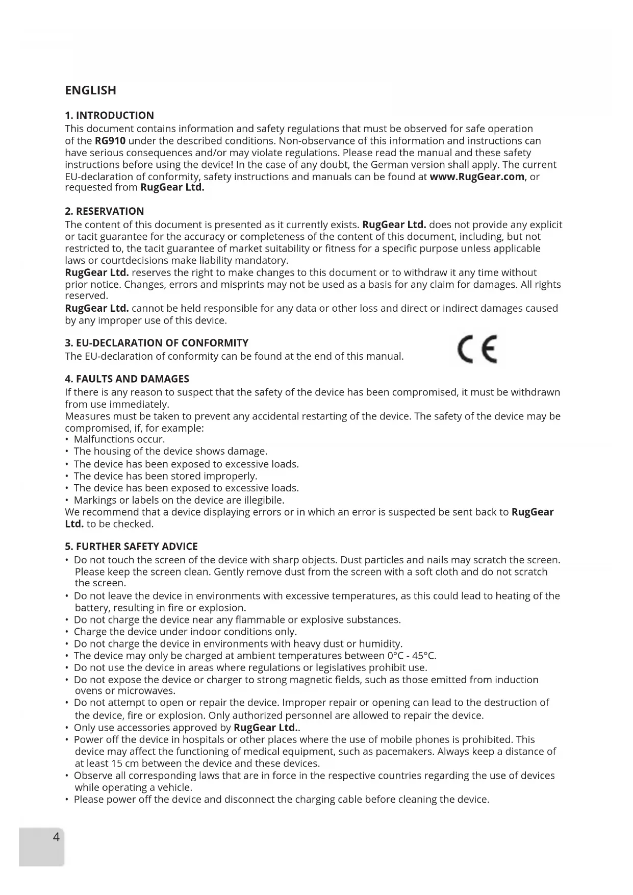 This document contains information and safety regulations that must be observed for safe operation of the RG910 under the described conditions. Non-observance of this information and instructions can have serious consequences and/or may violate regulations. Please read the manual and these safety instructions before using the device! In the case of any doubt, the German version shall apply. The current EU-declaration of conformity, safety instructions and manuals can be found at www.RugGear.com, or requested from RugGear Ltd.