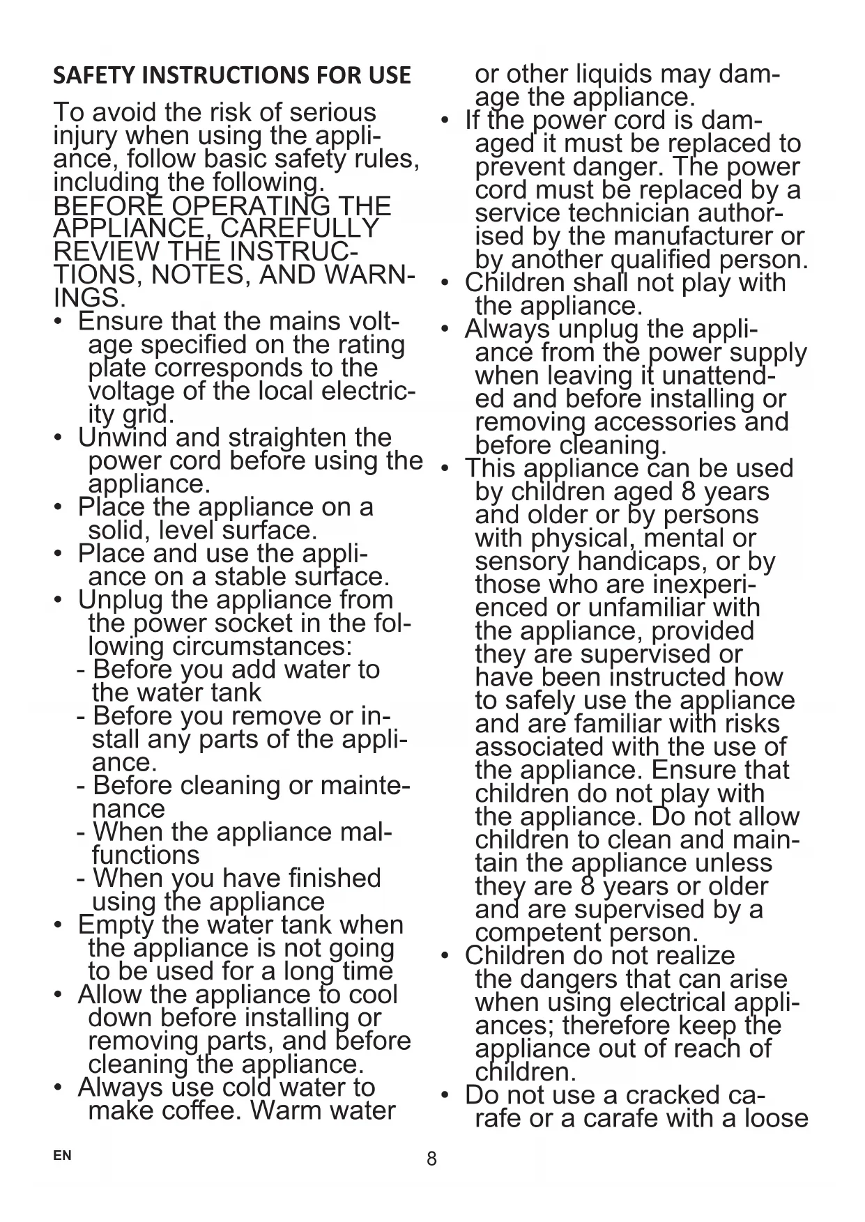 - Always use cold water to make coee. Warm water or other liquids may dam- age the appliance.