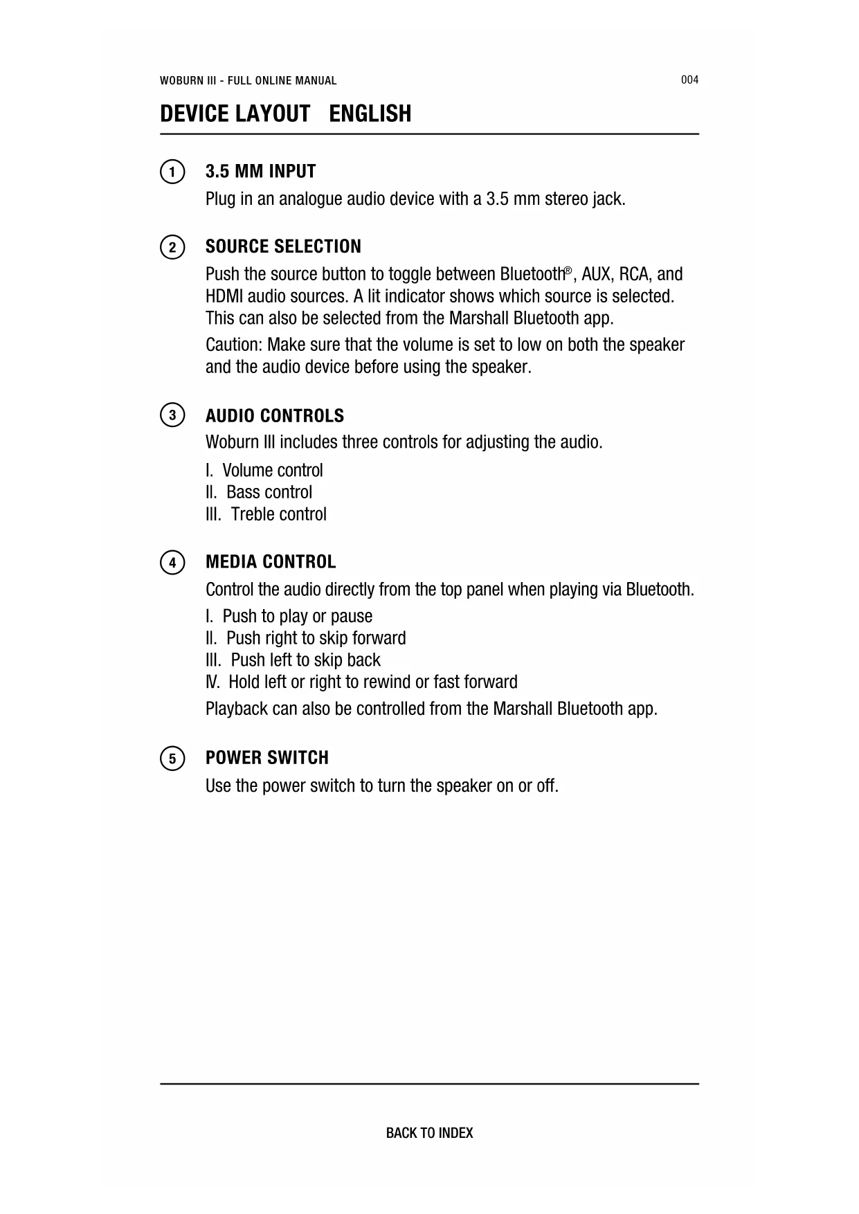 , AUX, RCA, and HDMI audio sources. A lit indicator shows which source is selected. This can also be selected from the Marshall Bluetooth app. Caution: Make sure that the volume is set to low on both the speaker and the audio device before using the speaker.