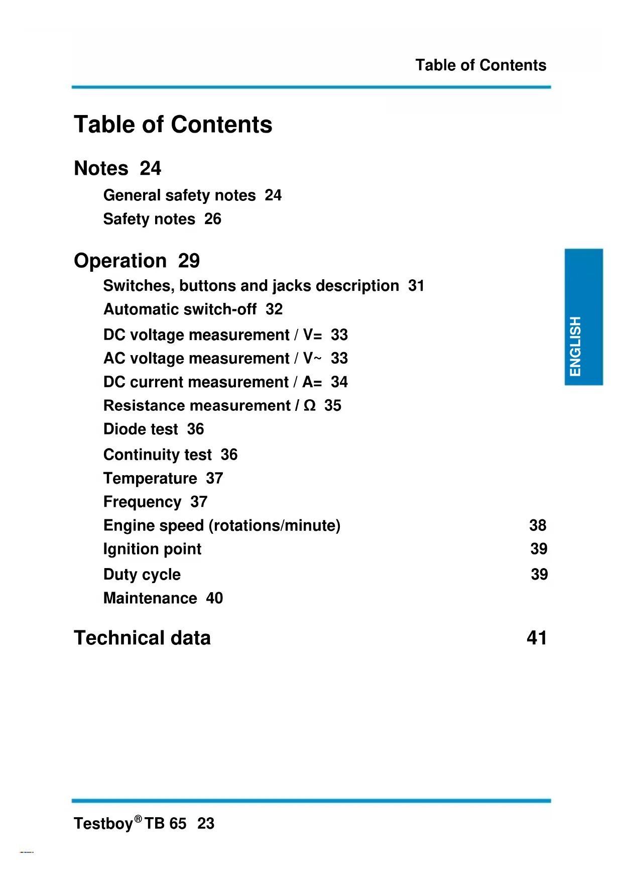 TB 65 23 ENGLISH ENGLISH ENGLISH ENGLISH Table of Contents Notes 24 General safety notes 24 Safety notes 26 Operation 29 Switches, buttons and jacks description 31 Automatic switch-off 32 DC voltage measurement / V= 33 AC voltage measurement / V~ 33 DC current measurement / A= 34 Resistance measurement / Ω 35 Diode test 36 Continuity test 36 Temperature 37 Frequency 37 Engine speed (rotations/minute) 38 Ignition point 39 Duty cycle 39 Maintenance 40 Technical data 41Notes