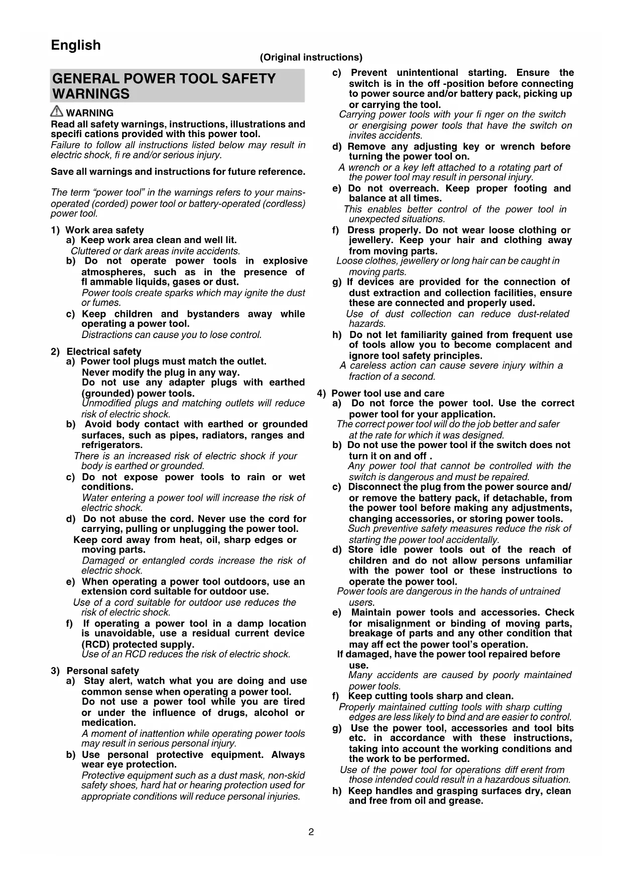 a) Do not force the power tool. Use the correct power tool for your application. The correct power tool will do the job better and safer at the rate for which it was designed. b) Do not use the power tool if the switch does not turn it on and off . Any power tool that cannot be controlled with the switch is dangerous and must be repaired. c) Disconnect the plug from the power source and/ or remove the battery pack, if detachable, from the power tool before making any adjustments, changing accessories, or storing power tools. Such preventive safety measures reduce the risk of starting the power tool accidentally. d) Store idle power tools out of the reach of children and do not allow persons unfamiliar with the power tool or these instructions to operate the power tool. Power tools are dangerous in the hands of untrained users. e) Maintain power tools and accessories. Check for misalignment or binding of moving parts, breakage of parts and any other condition that may aff ect the power tool’s operation. If damaged, have the power tool repaired before use. Many accidents are caused by poorly maintained power tools. f) Keep cutting tools sharp and clean. Properly maintained cutting tools with sharp cutting edges are less likely to bind and are easier to control. g) Use the power tool, accessories and tool bits etc. in accordance with these instructions, taking into account the working conditions and the work to be performed. Use of the power tool for operations diff erent from those intended could result in a hazardous situation. h) Keep handles and grasping surfaces dry, clean and free from oil and grease.