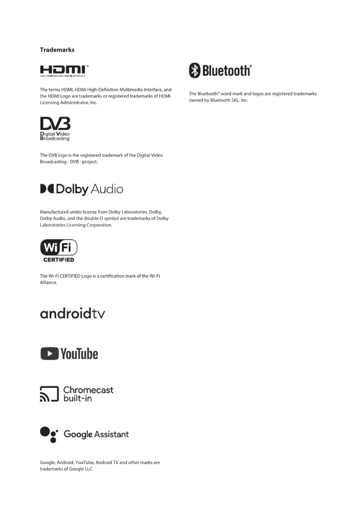- Hereby, Sharp Consumer Electronics Poland sp. z o.o. declares that this LED TV is in compliance with the essential requirements and other relevant provisions of RED Directive 2014/53/EU. The full text of the EU declaration of conformity is available by following the link www.umc-poland.com/declaration-of-conformity/ This equipment may be operated in all EU countries. Wi-Fi max transmitter power: 100 mW at 2,412 GHz – 2,472 GHz BT max transmitter power: 10 mW at 2,402 GHz – 2,480 GHz. In order to let customer to manage TV power consumption properly and save energy, there are declared three power consumption values on the device rating label: ECO – economy value, which provides minimum power consumption and which is available under default device condition (after reset, for example). Standard – the middle value, which re ects average power consumption under general device settings, after leaving of eco mode. Maximum – the value, which is achievable under highest device load conditions (max picture luminance, max sound volume, etc).