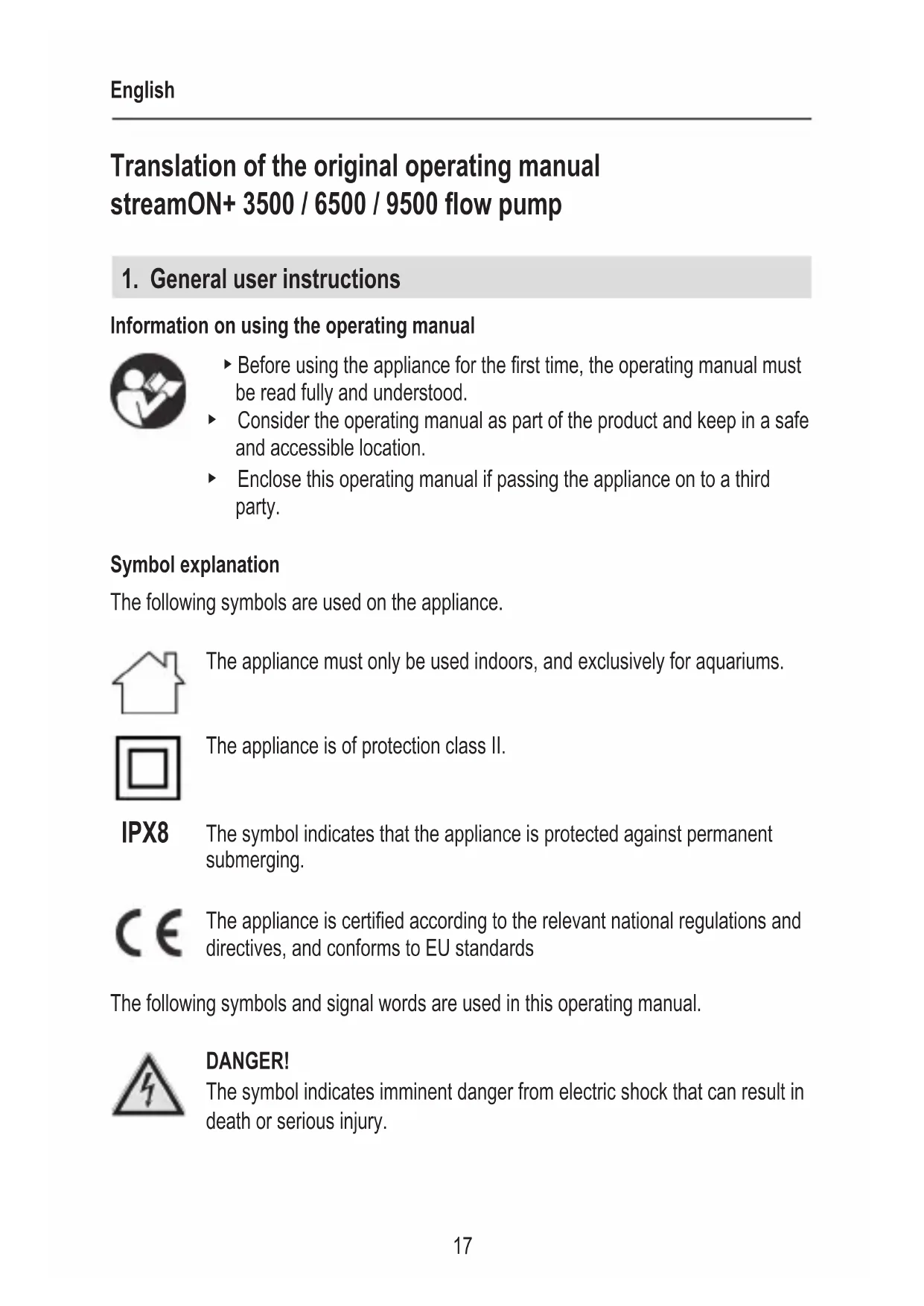 Information on using the operating manual ▶ Before using the appliance for the rst time, the operating manual must be read fully and understood. ▶ Consider the operating manual as part of the product and keep in a safe and accessible location. ▶ Enclose this operating manual if passing the appliance on to a third party. Symbol explanation The following symbols are used on the appliance. The appliance must only be used indoors, and exclusively for aquariums. The appliance is of protection class II. The symbol indicates that the appliance is protected against permanent submerging. The appliance is certied according to the relevant national regulations and directives, and conforms to EU standards The following symbols and signal words are used in this operating manual. DANGER! The symbol indicates imminent danger from electric shock that can result in death or serious injury. IPX8English