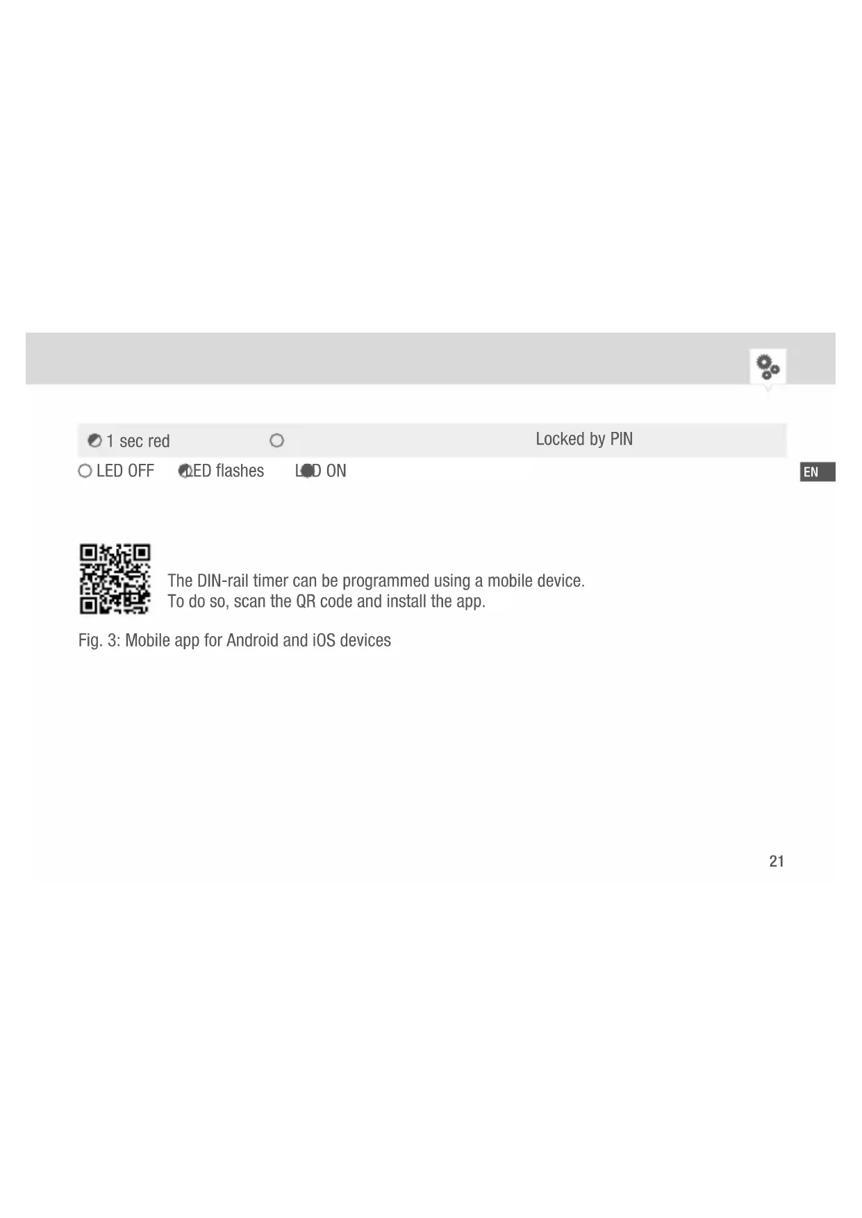 1 sec red Locked by PIN LED OFF LED ashes LED ON The DIN-rail timer can be programmed using a mobile device. To do so, scan the QR code and install the app. Fig. 3: Mobile app for Android and iOS devices22 Safety Intended use