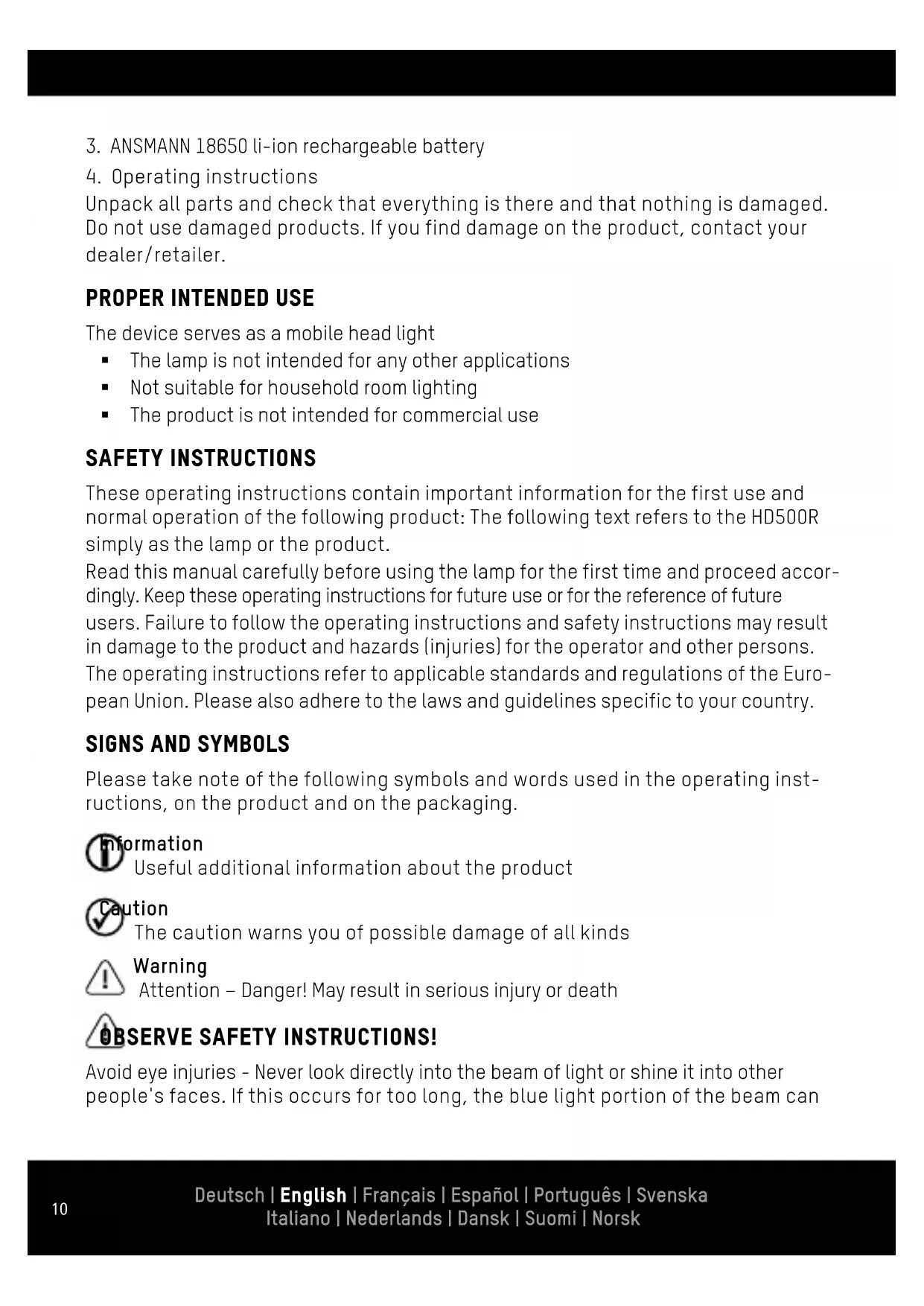 The device serves as a mobile head light § The lamp is not intended for any other applications § Not suitable for household room lighting § The product is not intended for commercial use SAFETY INSTRUCTIONS These operating instructions contain important information for the first use and normal operation of the following product: The following text refers to the HD500R simply as the lamp or the product. Read this manual carefully before using the lamp for the first time and proceed accor- dingly. Keep these operating instructions for future use or for the reference of future users. Failure to follow the operating instructions and safety instructions may result in damage to the product and hazards (injuries) for the operator and other persons. The operating instructions refer to applicable standards and regulations of the Euro- pean Union. Please also adhere to the laws and guidelines specific to your country.
