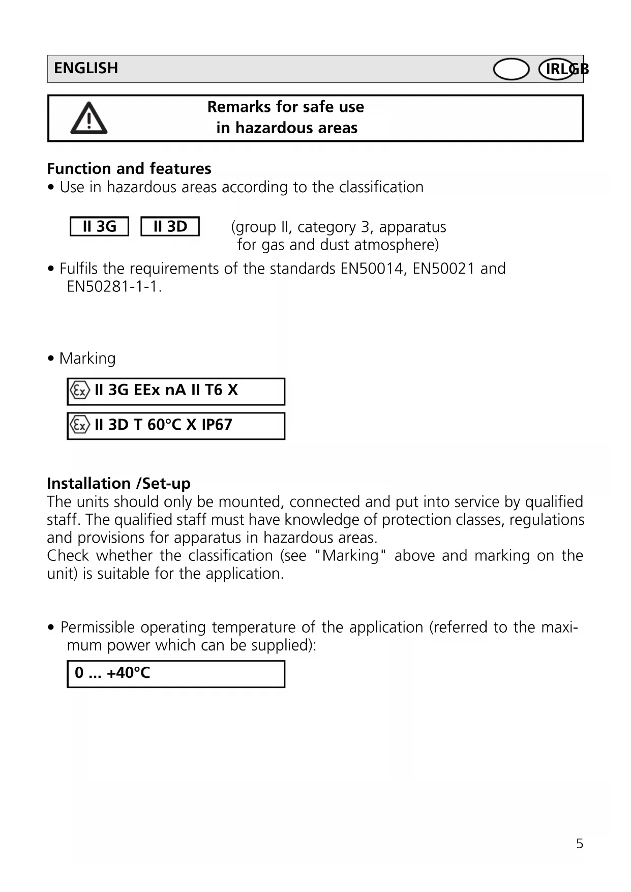 IRLGB ENGLISH• For use in hazardous areas according to the indication compliance with the protection rating is essential. Therefore appropriate care must be taken when mounting the housing and the seals, see installation instructions / mounting.