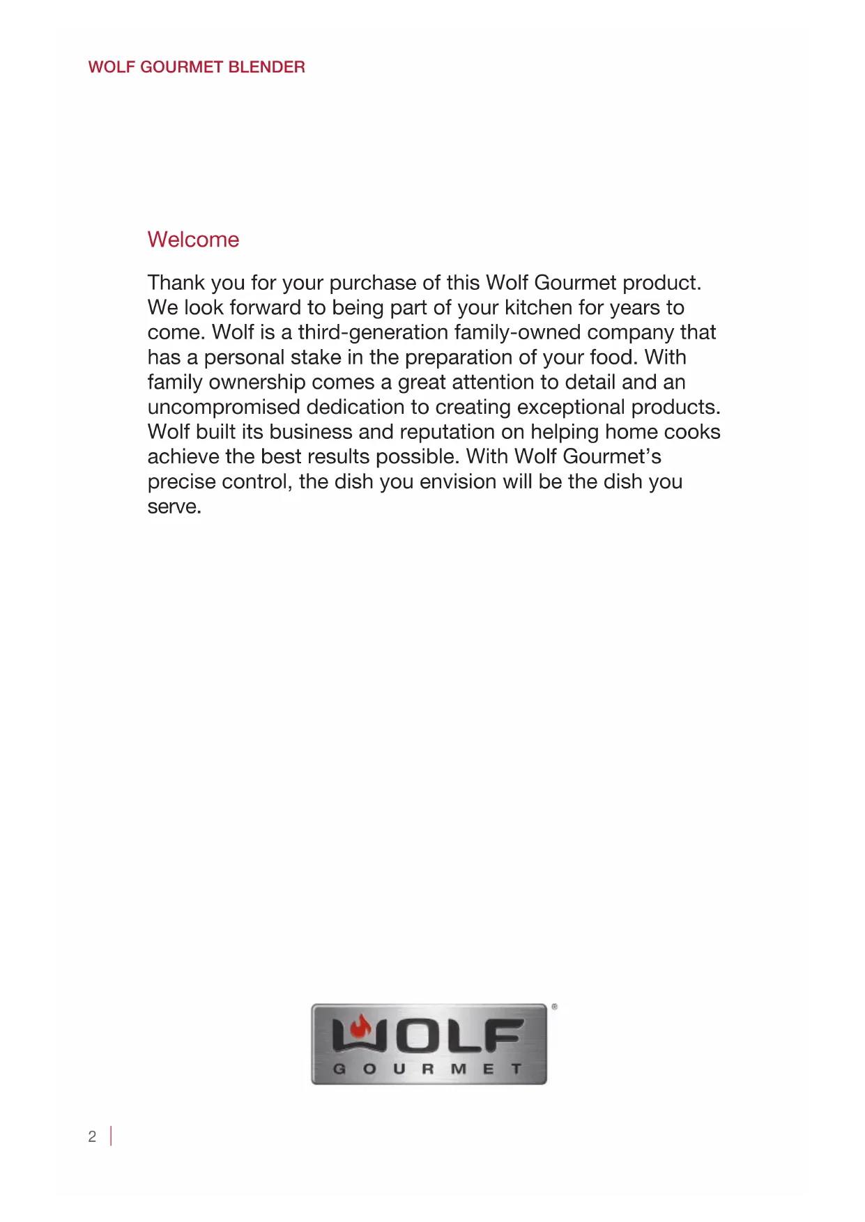 Welcome Thank you for your purchase of this Wolf Gourmet product. We look forward to being part of your kitchen for years to come. Wolf is a third-generation family-owned company that has a personal stake in the preparation of your food. With family ownership comes a great attention to detail and an uncompromised dedication to creating exceptional products. Wolf built its business and reputation on helping home cooks achieve the best results possible. With Wolf Gourmet’s precise control, the dish you envision will be the dish you serve.wolfgourmet.com