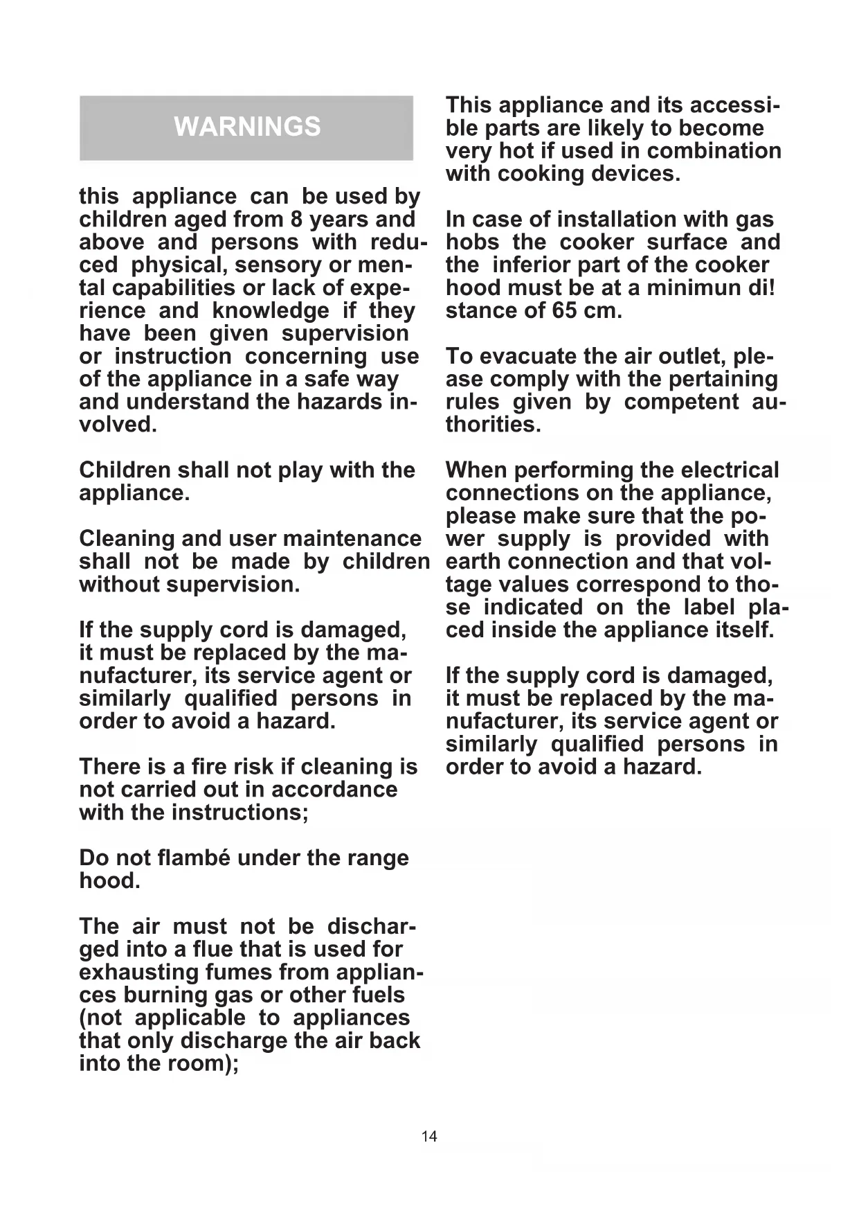 13This appliance and its accessi- ble parts are likely to become very hot if used in combination with cooking devices. In case of installation with gas hobs the cooker surface and the inferior part of the cooker hood must be at a minimun di! stance of 65 cm. To evacuate the air outlet, ple- ase comply with the pertaining rules given by competent au- thorities. When performing the electrical connections on the appliance, please make sure that the po- wer supply is provided with earth connection and that vol- tage values correspond to tho- se indicated on the label pla- ced inside the appliance itself. If the supply cord is damaged, it must be replaced by the ma- nufacturer, its service agent or similarly qualied persons in order to avoid a hazard. WARNINGS this appliance can be used by children aged from 8 years and above and persons with redu- ced physical, sensory or men- tal capabilities or lack of expe- rience and knowledge if they have been given supervision or instruction concerning use of the appliance in a safe way and understand the hazards in- volved. Children shall not play with the appliance. Cleaning and user maintenance shall not be made by children without supervision. If the supply cord is damaged, it must be replaced by the ma- nufacturer, its service agent or similarly qualied persons in order to avoid a hazard. There is a re risk if cleaning is not carried out in accordance with the instructions; Do not ambé under the range hood. The air must not be dischar- ged into a ue that is used for exhausting fumes from applian- ces burning gas or other fuels (not applicable to appliances that only discharge the air back into the room); 14Before carrying out any cle- aning or maintaining opera- tions, the appliance needs to be removed from the electric grid. If the appliance is not provided with a non-separable exible cable and plug, or with ano- ther device ensuring discon- nections from the grid, with an opening distance between the contacts of at least 3 mm, then such disconnecting devices must be supplied within the - xed installation. If the xed appliance is endo wed with a supply cord and a plug, the appliance has to be put in a place where the plug can be reached easily. Before carrying out the instal- lation of the appliance, please check that all components are not damaged. In such a case, make contact with your retailer and do not proceed with the in- stallation. Should the product show any anomaly, disconnect the ap- pliance from the power supply. When the range hood and ap- pliances supplied with energy other than electricity are simul- taneously in operation, the negative pressure in the room must not exceed 4 Pa (4 x 10-5 bar). 15USES The appliance is already arranged both for ltering and for suction performances.