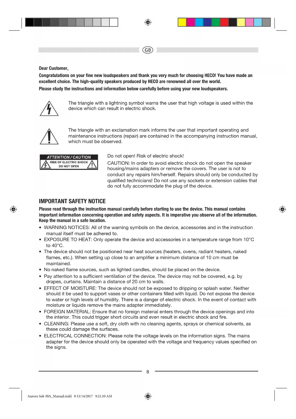 - ELECTRICAL CONNECTION: Please note the voltage levels on the information signs. The mains adapter for the device should only be operated with the voltage and frequency values specified on the signs. Aurora Sub 30A_Manual.indd 8 11/14/2017 9:21:10 AM9