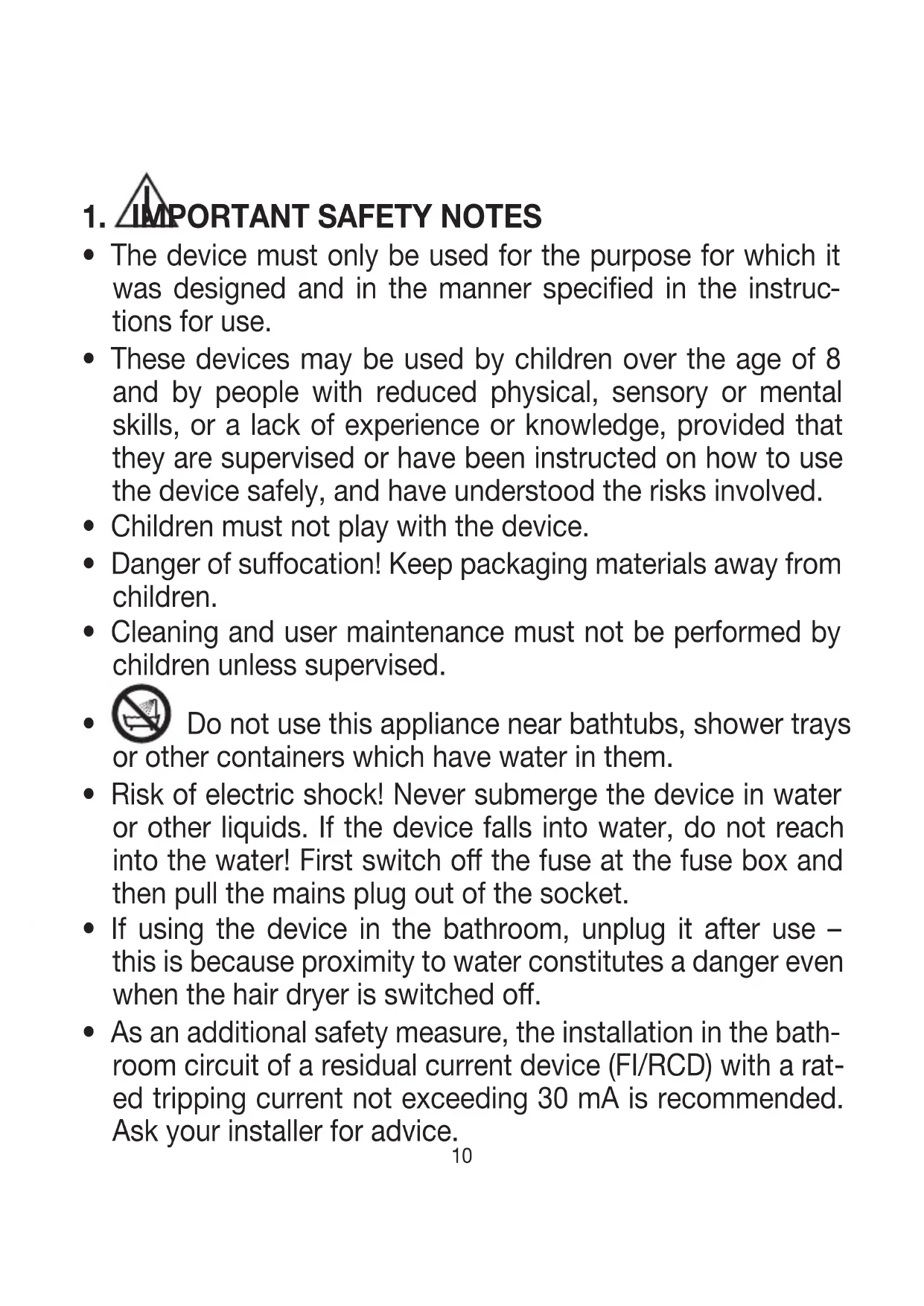 The following symbols are used on the device, in these instructions for use, on the pack- aging and on the type plate for the device: This device must not be used near water or in water (e.g. in a wash basin, or in the shower or bath) – risk of electric shock! Warning notice indicating a risk of injury or damage to health.