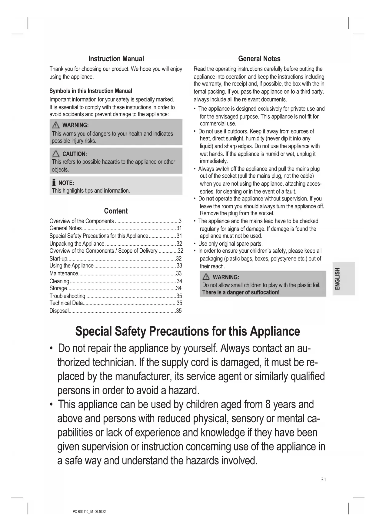 - This appliance can be used by children aged from 8 years and above and persons with reduced physical, sensory or mental ca- pabilities or lack of experience and knowledge if they have been given supervision or instruction concerning use of the appliance in a safe way and understand the hazards involved.PC-BS3110_IM 06.10.22