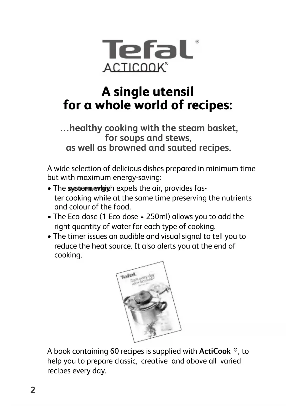 - The timer issues an audible and visual signal to tell you to reduce the heat source. It also alerts you at the end of cooking. A book containing 60 recipes is supplied with ActiCook