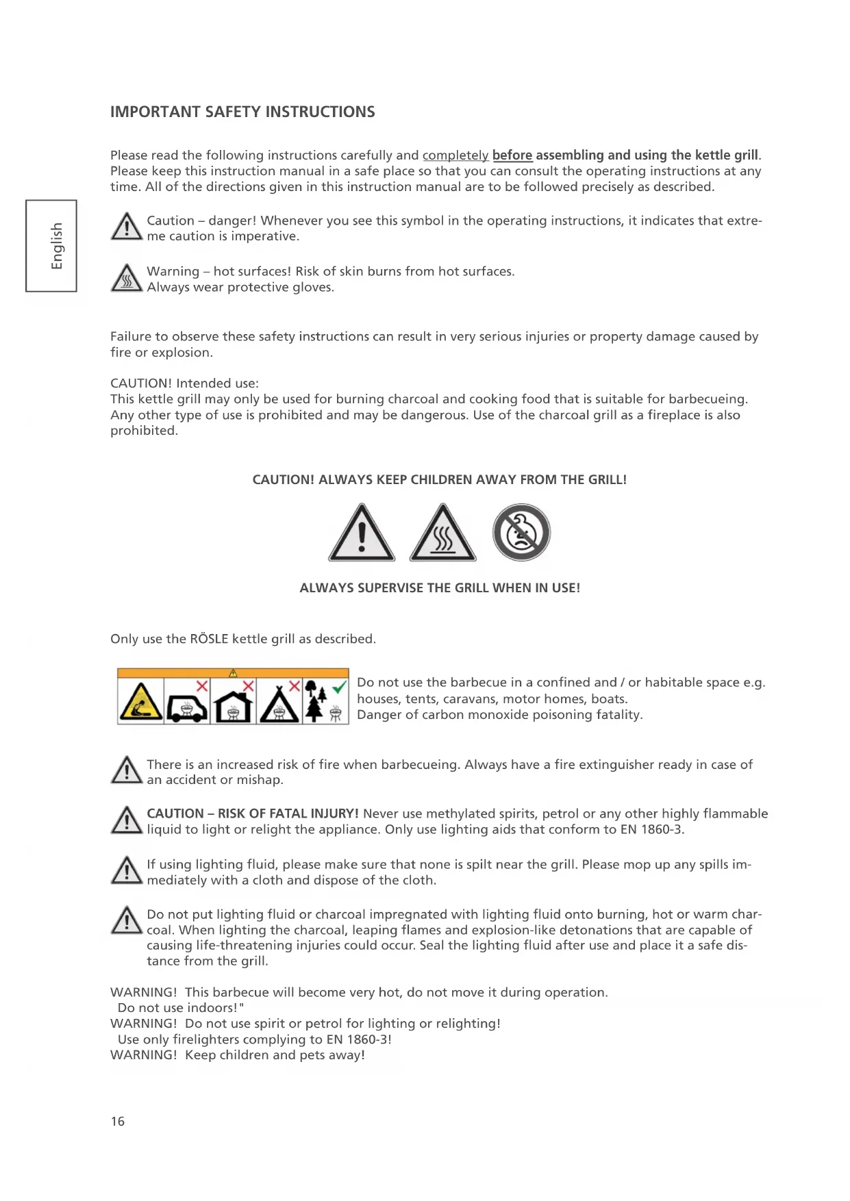Please read the following instructions carefully and completely before assembling and using the kettle grill. Please keep this instruction manual in a safe place so that you can consult the operating instructions at any time. All of the directions given in this instruction manual are to be followed precisely as described. Caution – danger! Whenever you see this symbol in the operating instructions, it indicates that extre- me caution is imperative. Warning – hot surfaces! Risk of skin burns from hot surfaces. Always wear protective gloves. Failure to observe these safety instructions can result in very serious injuries or property damage caused by re or explosion. CAUTION! Intended use: This kettle grill may only be used for burning charcoal and cooking food that is suitable for barbecueing. Any other type of use is prohibited and may be dangerous. Use of the charcoal grill as a replace is also prohibited. CAUTION! ALWAYS KEEP CHILDREN AWAY FROM THE GRILL! ALWAYS SUPERVISE THE GRILL WHEN IN USE! Only use the RÖSLE kettle grill as described. Do not use the barbecue in a conned and / or habitable space e.g. houses, tents, caravans, motor homes, boats. Danger of carbon monoxide poisoning fatality. There is an increased risk of re when barbecueing. Always have a re extinguisher ready in case of an accident or mishap. CAUTION – RISK OF FATAL INJURY! Never use methylated spirits, petrol or any other highly ammable liquid to light or relight the appliance. Only use lighting aids that conform to EN 1860-3. If using lighting uid, please make sure that none is spilt near the grill. Please mop up any spills im- mediately with a cloth and dispose of the cloth. Do not put lighting uid or charcoal impregnated with lighting uid onto burning, hot or warm char- coal. When lighting the charcoal, leaping ames and explosion-like detonations that are capable of causing life-threatening injuries could occur. Seal the lighting uid after use and place it a safe dis- tance from the grill. WARNING! This barbecue will become very hot, do not move it during operation. Do not use indoors!" WARNING! Do not use spirit or petrol for lighting or relighting! Use only relighters complying to EN 1860-3! WARNING! Keep children and pets away!17 English CAUTION! Children and pets should never be left unattended near to a hot grill. CAUTION! This kettle grill gets very hot and must not be moved while in use. Other important notes on potential hazards Do not use in enclosed spaces as otherwise poisonous vapours may collect that could cause serious