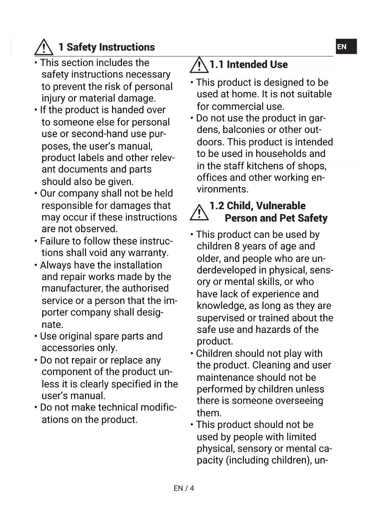 - Children should not play with the product. Cleaning and user maintenance should not be performed by children unless there is someone overseeing them.