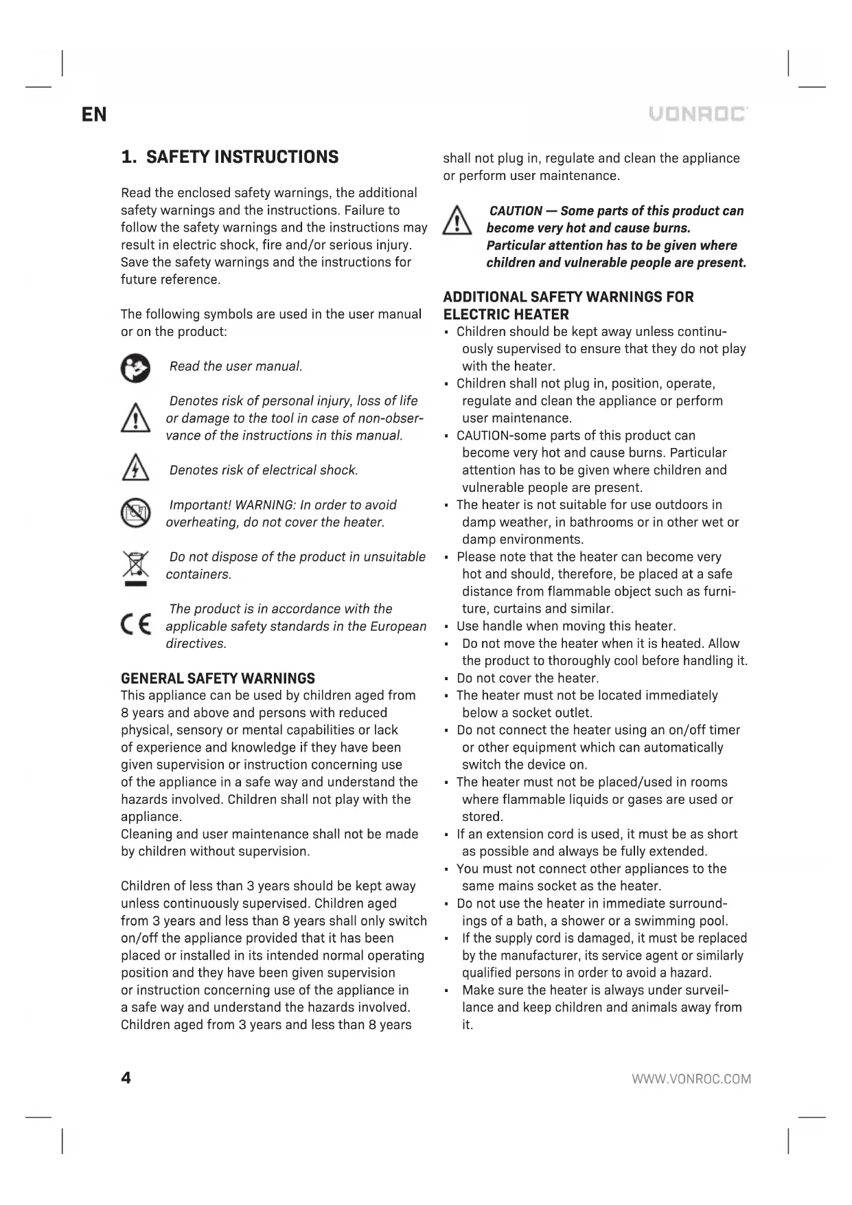 - When you store the heater, let it cool down first and, keep it dry. Trouble shooting In case the electric heater does not work well, we give you subjoined some possible causes and their solutions. Problem Possible cause Solution The heater does not operate, even when it is plugged in and the switch, thermostat are switched on. The plug is loose, bad connection Pull out the plug, check the connection of the plug and socket. Then connect again. No power in socket outlet Insert the plug in aproper socket Tip-over protection Put the heater on afirm and level surface. Overheat protection Unplug the heater and wait at least 30 minutes to cool down before restarting the heater. Problem Possible cause Solution The heating element glowing The input voltage is too high or too low Use power supply according to the rating on the label The air inlet (3) grill is blocked Keep the heater far way from articles like curtain, plastic bag, paper and other things which can cover the inlet or can be easily cover on the air inlet The appliance didn’t heat up, only ventilator worked The switch was not put at heating setting Turn the switch to heat setting The thermostat operated Turn the thermostat and listen if there is open/close voice. If there is no click and the thermostat is not damaged, the heater will automatic switch on when the appliance cooled down The self-retting cut-out operated Turn the heater off and inspect the blockage of inlet or outlet. Disconnect the plug and wait at least 10 minutes for the protection system to reset before attempting to restart the heater. Abnormal noise The appliance is not stands upright Put the heater on alevel surface ENVIRONMENT Faulty and/or discarded electrical or electronic apparatus have to be collected at the appropriate recycling locations. Only for EC countries Do not dispose of power tools into domestic waste. According to the European Guideline 2012/19/ EU for Waste Electrical and Electronic Equipment and its implementation into national right, power tools that are no longer usable must be collected separately and disposed of in an environmentally friendly way. WARRANTY VONROC products are developed to the highest quality standards and are guaranteed free of defects in both materials and workmanship for the period lawfully stipulated starting from the date of original purchase. Should the product develop any failure during this period due to defective material and/or workmanship then contact VONROC directly.8
