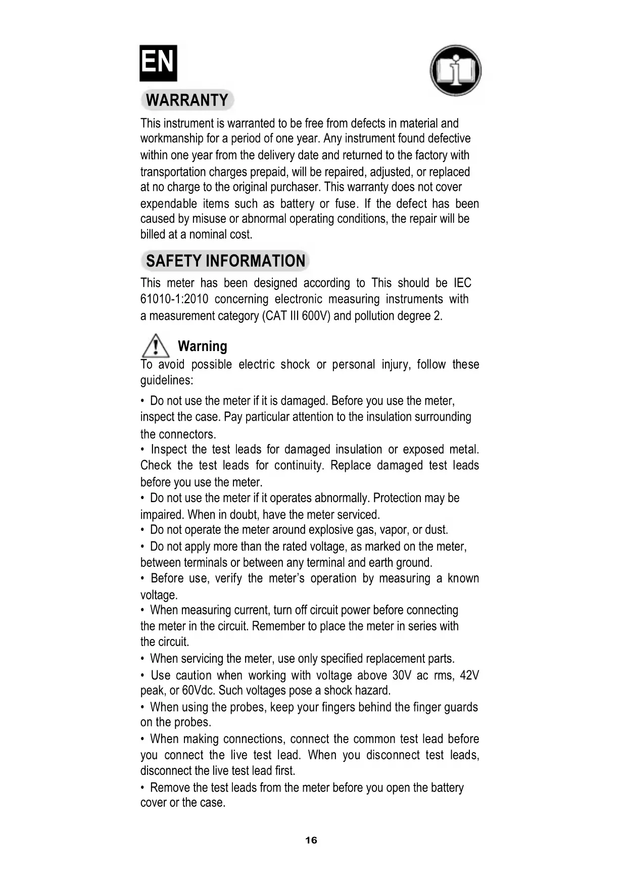 % Unit of duty cycle %: Percent GENERAL SPECIFICATION Display: 3 3/4-digit LCD, with a max. reading 3999 Overrange Indication: "OL" shown on the display Negative Polarity Indication: negative sign " " shown on the display automatically Sampling Rate: 2 -3 times/sec Operating Environment: 0°C ~ 40°C, < 75%RH Temperature Coefficient: 0.2 x (specified accuracy)/°C (< 18°C or > 28°C) Storage Environment: - 10°C ~ 50°C, <85%RH Operating Altitude: 0 to 2000 meters Battery: 9V, 6F22 or equivalent, 1 piece Low Battery Indication: " " shown on the display Size: 217x100x49mm Weight: about 500g (including battery) IP: 51 SPECIFICATIONS Accuracy is specified for a period of one year after calibration and at 18°C to 28°C, with relative humidity < 75%. Except where specified, accuracy is specified from 8% to 100% of range. DC Voltage Range Resolution Accuracy 400mV 0.1mV ± (1.0% + 5) 4V 0.001V ± (0.8% + 3) 40V 0.01V 400V 0.1V 600V 1V ± (1% + 5) Input Impedance: the range 400mV: >1000MΩ / the other ranges: 10MΩ Overload Protection: 600V DC/AC rms21 AC Voltage Range Resolution Accuracy 4V 0.001V ± (1.0% + 5) 40V 0.01V 400V 0.1V 600V 1V ± (1.2% + 5) Input Impedance: 10MΩ Frequency Range: 40Hz -400Hz Response: Average, calibrated in rms of sine wave Overload Protection: 600V DC/AC rms DC Current Range Resolution Accuracy 400µA 0.1µA ± (1.2% + 3) 4000µA 1µA 40mA 0.01mA ± (1.5% + 3) 400mA 0.1mA 4A 0.001A ± (1.8% + 3) 10A 0.01A ± (2.0% + 5) Overload Protection: Fuse 1: F 400mA/690V - Fuse 2: F 10A/690V Max. Input Current: 10A (For inputs > 2A: measurement duration < 10 secs, interval > 15 minutes) Max. Measurement Voltage Drop: 400mV Note: The 10A range is specified from 20% to 100% of range. AC Current Range Resolution Accuracy 400µA 0.1µA ± (1.5% + 5) 4000µA 1µA 40mA 0.01mA ± (1.8% + 5) 400mA 0.1mA 4A 0.001A ± (2.0% + 5) 10A 0.01A ± (2.5% + 10) Overload Protection: Fuse 1: F 400mA/690V Fuse 2: F 10A/690V Max. Input Current: 10A (For inputs > 2A: measurement duration < 10 secs, interval > 15 minutes) Frequency Range: 40Hz ~ 400Hz Response: Average, calibrated in rms of sine wave Max. Voltage Drop: 400mV Note: The 10A range is specified from 20% to 100% of range.22 Frequency Range Resolution Accuracy 9.999Hz 0.001Hz ± (1.0% + 3) 99.99Hz 0.01Hz ± (0.8% + 3) 999.9Hz 0.1Hz 9.999kHz 1Hz 99.99kHz 10kHz 999.9kHz 10kHz not specified Input Voltage: 1Vrms -20Vrms Duty Cycle Range Resolution Accuracy 5% ~ 99% 0.1% 1 Hz ~10kHz: ± (2% + 5) > 10kHz: not specified Input Voltage: 3Vp-p ~ 10Vp-p Overload Protection: 600V DC/AC rms Resistance Range Resolution Accuracy 400Ω 0.1Ω ± (1.0% + 5) 4kΩ 0.001kΩ ± (1.0% + 3) 40kΩ 0.01kΩ 400kΩ 0.1kΩ 4MΩ 0.001MΩ 40MΩ 0.01MΩ ± (1.8% + 5) Capacitance Range Resolution Accuracy 40nF 0.01nF ± (4%+20)(REL) 400nF 0.1nF ± (3%+5)(REL) 4µF 0.001µF ± (4% + 5) 40µF 0.01µF 100µF 0.1µF ± (8% + 5) For the ranges ≤ 400nF, use Relative mode (REL) to subtract the stray capacitance of the test leads and the Meter. For the range of 100µF, wait about 30 secs for the reading to settle.23 Diode Test Range Introduction Remark