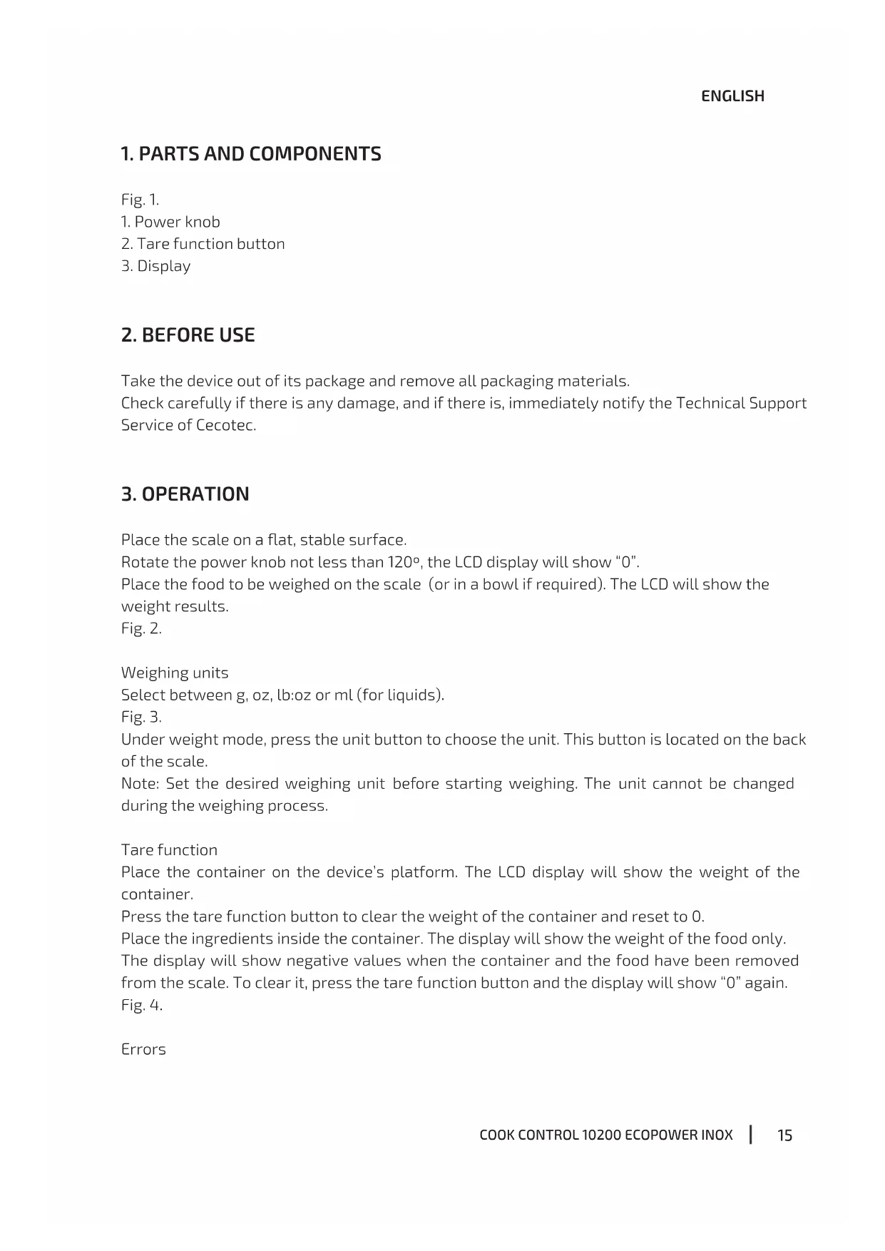 Place the scale on a at, stable surface. Rotate the power knob not less than 120º, the LCD display will show “0”. Place the food to be weighed on the scale (or in a bowl if required). The LCD will show the weight results. Fig. 2. Weighing units Select between g, oz, lb:oz or ml (for liquids). Fig. 3. Under weight mode, press the unit button to choose the unit. This button is located on the back of the scale. Note: Set the desired weighing unit before starting weighing. The unit cannot be changed during the weighing process. Tare function Place the container on the device’s platform. The LCD display will show the weight of the container. Press the tare function button to clear the weight of the container and reset to 0. Place the ingredients inside the container. The display will show the weight of the food only. The display will show negative values when the container and the food have been removed from the scale. To clear it, press the tare function button and the display will show “0” again. Fig. 4. Errors16 ENGLISH