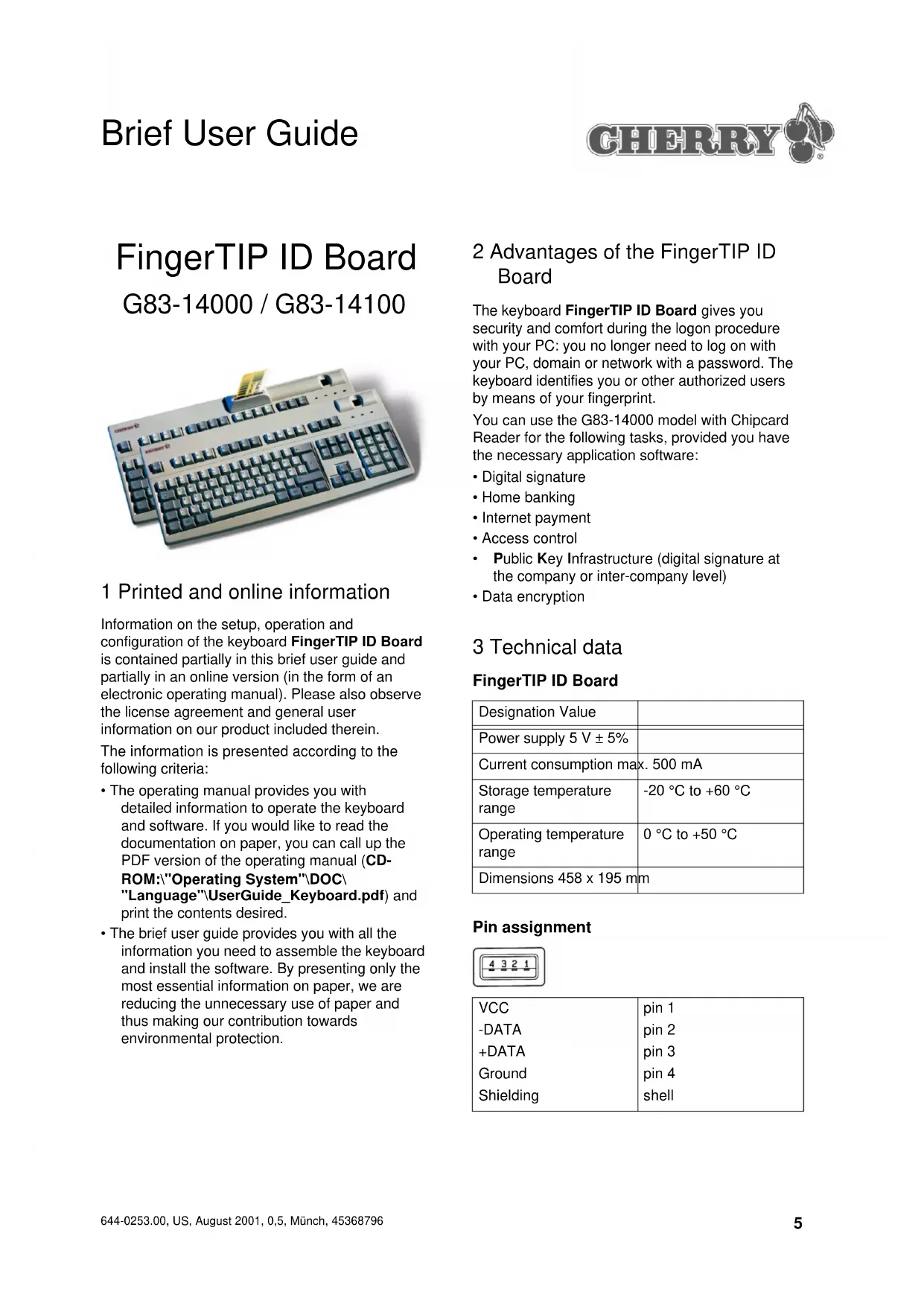 - The brief user guide provides you with all the information you need to assemble the keyboard and install the software. By presenting only the most essential information on paper, we are reducing the unnecessary use of paper and thus making our contribution towards environmental protection. 2 Advantages of the FingerTIP ID Board The keyboard FingerTIP ID Board gives you security and comfort during the logon procedure with your PC: you no longer need to log on with your PC, domain or network with a password. The keyboard identifies you or other authorized users by means of your fingerprint. You can use the G83-14000 model with Chipcard Reader for the following tasks, provided you have the necessary application software: