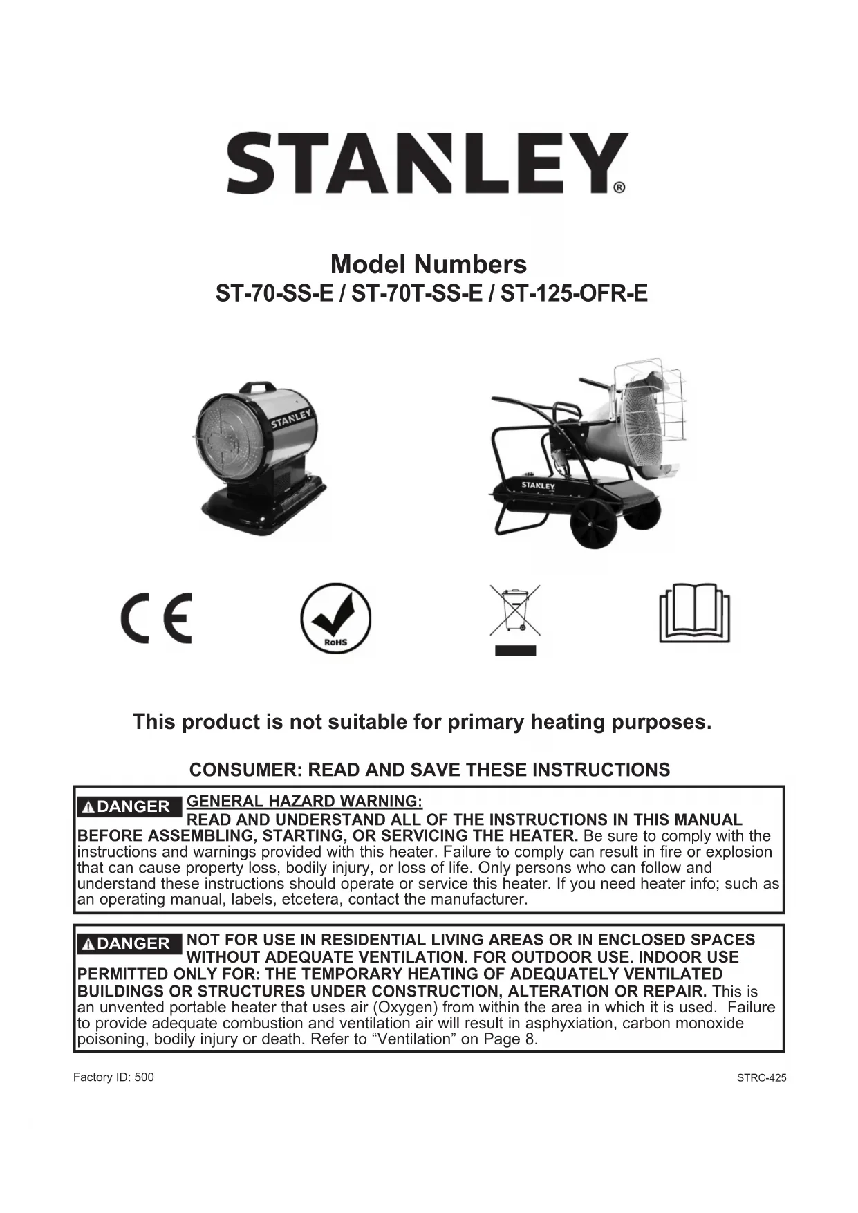 REP Obelis S.A. Siedziba rmy: Bd. Général Wahis, 53 1030 Brussels, Belgium © 2021 Stanley Black & Decker, Inc.CONSUMER: READ AND SAVE THESE INSTRUCTIONS GENERAL HAZARD WARNING: READ AND UNDERSTAND ALL OF THE INSTRUCTIONS IN THIS MANUAL BEFORE ASSEMBLING, STARTING, OR SERVICING THE HEATER. Be sure to comply with the instructions and warnings provided with this heater. Failure to comply can result in fire or explosion that can cause property loss, bodily injury, or loss of life. Only persons who can follow and understand these instructions should operate or service this heater. If you need heater info; such as an operating manual, labels, etcetera, contact the manufacturer. DANGER NOT FOR USE IN RESIDENTIAL LIVING AREAS OR IN ENCLOSED SPACES WITHOUT ADEQUATE VENTILATION. FOR OUTDOOR USE. INDOOR USE PERMITTED ONLY FOR: THE TEMPORARY HEATING OF ADEQUATELY VENTILATED BUILDINGS OR STRUCTURES UNDER CONSTRUCTION, ALTERATION OR REPAIR. This is an unvented portable heater that uses air (Oxygen) from within the area in which it is used. Failure to provide adequate combustion and ventilation air will result in asphyxiation, carbon monoxide poisoning, bodily injury or death. Refer to “Ventilation” on Page 8. DANGER Factory ID: 500 Model Numbers