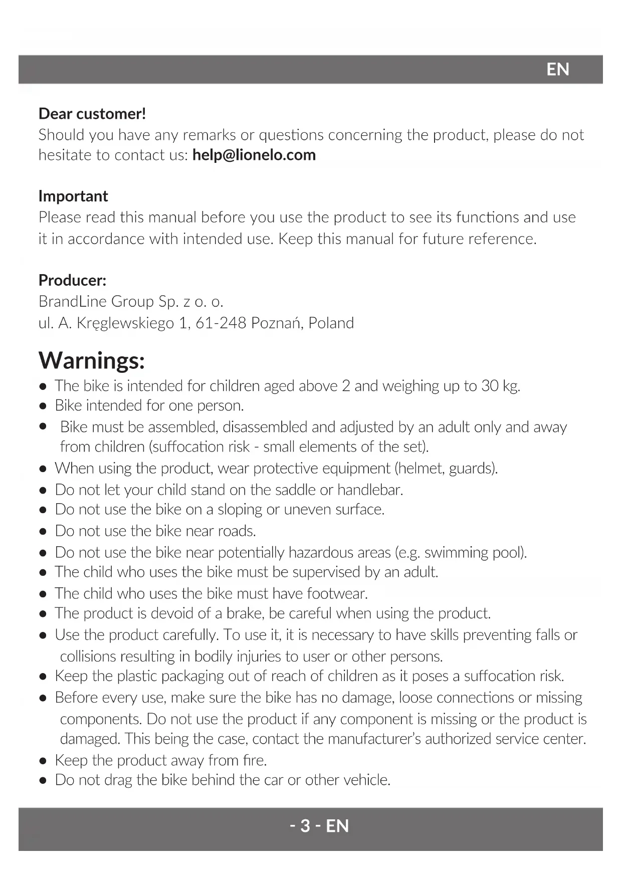 Dear customer! Should you have any remarks or quesons concerning the product, please do not hesitate to contact us: help@lionelo.com Important Please read this manual before you use the product to see its funcons and use it in accordance with intended use. Keep this manual for future reference. Producer: BrandLine Group Sp. z o. o. ul. A. Kręglewskiego 1, 61-248 Poznań, Poland Warnings: