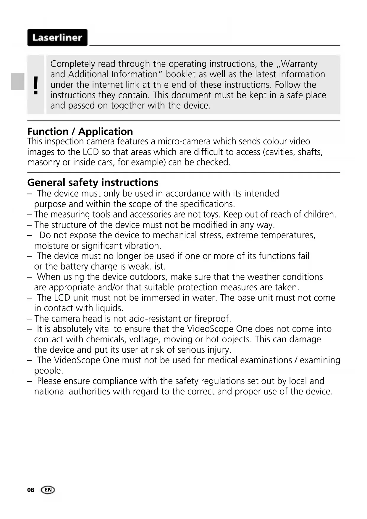 The measuring tools and accessories are not toys. Keep out of reach of children. – The structure of the device must not be modied in any way. – Do not expose the device to mechanical stress, extreme temperatures, moisture or signicant vibration. – The device must no longer be used if one or more of its functions fail or the battery charge is weak. ist. – When using the device outdoors, make sure that the weather conditions are appropriate and/or that suitable protection measures are taken. – The LCD unit must not be immersed in water. The base unit must not come in contact with liquids. – The camera head is not acid-resistant or reproof. – It is absolutely vital to ensure that the VideoScope One does not come into contact with chemicals, voltage, moving or hot objects. This can damage the device and put its user at risk of serious injury. – The VideoScope One must not be used for medical examinations / examining people. – Please ensure compliance with the safety regulations set out by local and national authorities with regard to the correct and proper use of the device. Function / Application This inspection camera features a micro-camera which sends colour video images to the LCD so that areas which are difcult to access (cavities, shafts, masonry or inside cars, for example) can be checked. Completely read through the operating instructions, the „Warranty and Additional Information“ booklet as well as the latest information under the internet link at th e end of these instructions. Follow the instructions they contain. This document must be kept in a safe place and passed on together with the device. !VideoScope One