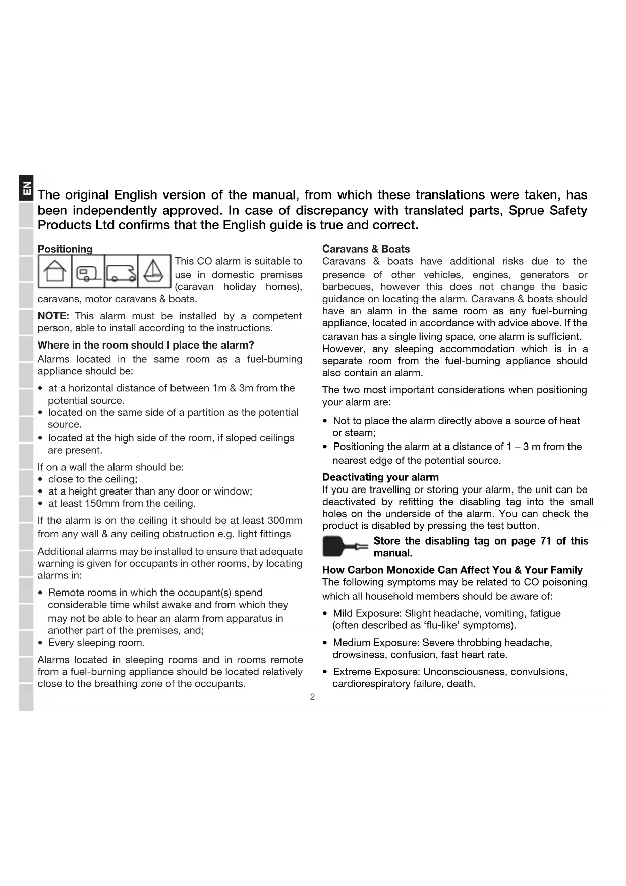 - Positioning the alarm at a distance of 1 – 3 m from the nearest edge of the potential source. Deactivating your alarm If you are travelling or storing your alarm, the unit can be deactivated by retting the disabling tag into the small holes on the underside of the alarm. You can check the product is disabled by pressing the test button. Store the disabling tag on page 71 of this manual. How Carbon Monoxide Can Affect You & Your Family The following symptoms may be related to CO poisoning which all household members should be aware of: