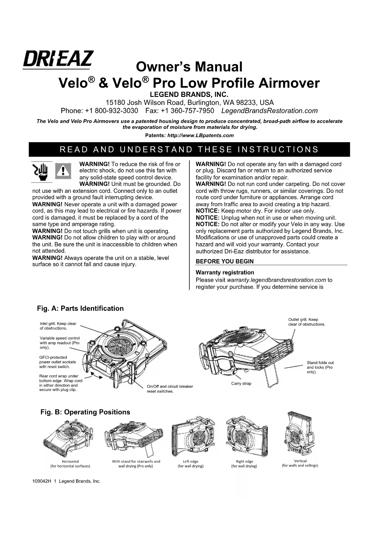 Warranty registration Please visit warranty.legendbrandsrestoration.com to register your purchase. If you determine service is Fig. B: Operating Positions Horizontal (for horizontal surfaces) Vertical (for walls and ceilings) Right edge (for wall drying) Left edge (for wall drying) With stand for stairwells and wall drying (Pro only) Rear cord wrap under bottom edge. Wrap cord in either direction and secure with plug clip. Variable speed control with amp readout (Pro only). Stand folds out and locks (Pro only). Inlet grill. Keep clear of obstructions. Outlet grill. Keep clear of obstructions. On/Off and circuit breaker reset switches. GFCI-protected power outlet sockets with reset switch. Carry strap Fig. A: Parts Identification109042H 2 Legend Brands, Inc. required, have your equipment model, serial number and original proof of purchase available and call your distributor for assistance with obtaining a return material authorization (RMA). OPERATING INSTRUCTIONS Note that the Velo can be placed in a variety of positions for drying and air circulation. See Fig. B for details.
