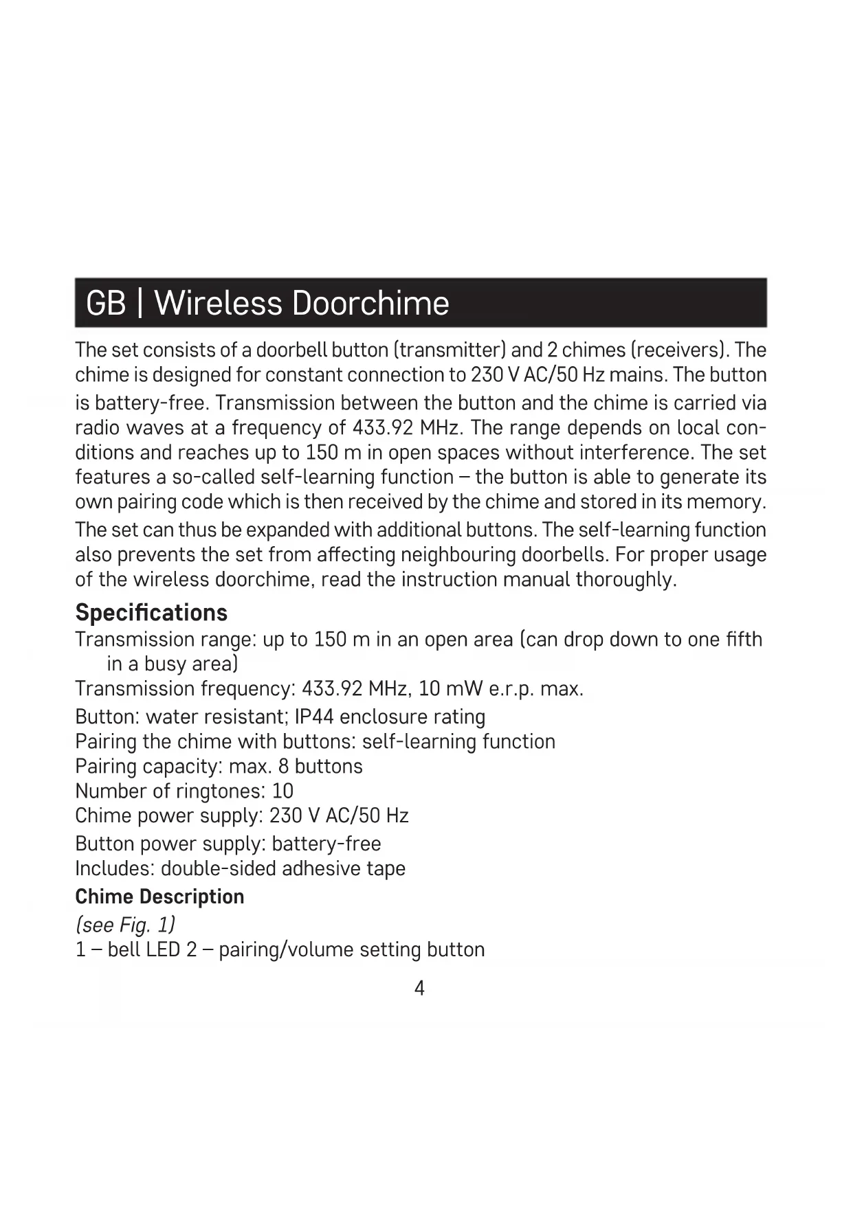 GB | Wireless Doorchime The set consists of a doorbell button (transmitter) and 2 chimes (receivers). The chime is designed for constant connection to 230 V AC/50 Hz mains. The button is battery-free. Transmission between the button and the chime is carried via radio waves at a frequency of 433.92 MHz. The range depends on local con- ditions and reaches up to 150 m in open spaces without interference. The set features a so-called self-learning function – the button is able to generate its own pairing code which is then received by the chime and stored in its memory. The set can thus be expanded with additional buttons. The self-learning function also prevents the set from aecting neighbouring doorbells. For proper usage of the wireless doorchime, read the instruction manual thoroughly. Specications Transmission range: up to 150 m in an open area (can drop down to one fth in a busy area) Transmission frequency: 433.92 MHz, 10 mW e.r.p. max. Button: water resistant; IP44 enclosure rating Pairing the chime with buttons: self-learning function Pairing capacity: max. 8 buttons Number of ringtones: 10 Chime power supply: 230 V AC/50 Hz Button power supply: battery-free Includes: double-sided adhesive tape Chime Description (see Fig. 1) 1 – bell LED 2 – pairing/volume setting button5 3 – ringtone change 4 – speaker Button Description (see Fig. 2) 1 – button LED 2 – ring button 3 – hole for opening the battery cover 4 – openings for mounting onto a wall Pairing the Button with the Chime