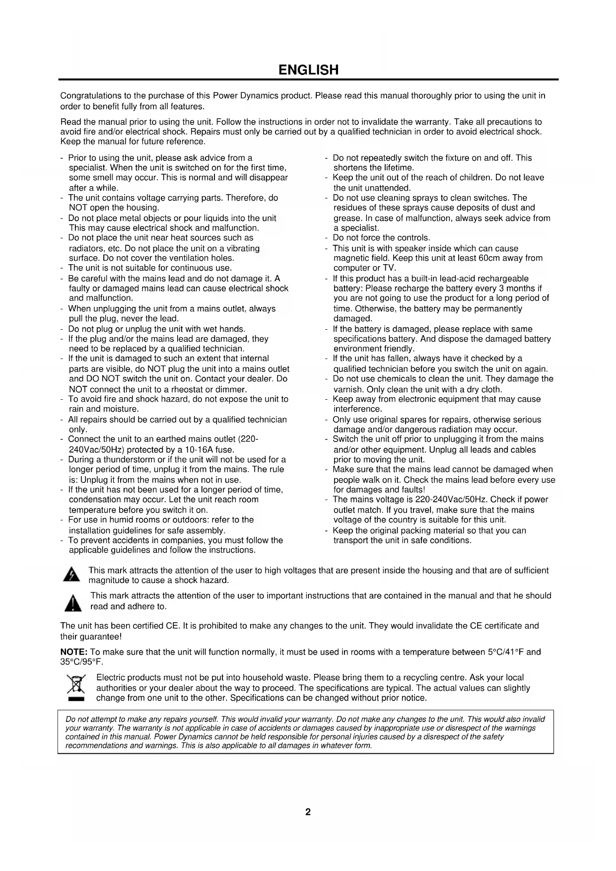 V1.62 ENGLISH Congratulations to the purchase of this Power Dynamics product. Please read this manual thoroughly prior to using the unit in order to benefit fully from all features. Read the manual prior to using the unit. Follow the instructions in order not to invalidate the warranty. Take all precautions to avoid fire and/or electrical shock. Repairs must only be carried out by a qualified technician in order to avoid electrical shock. Keep the manual for future reference. - Prior to using the unit, please ask advice from a specialist. When the unit is switched on for the first time, some smell may occur. This is normal and will disappear after a while. - The unit contains voltage carrying parts. Therefore, do NOT open the housing. - Do not place metal objects or pour liquids into the unit This may cause electrical shock and malfunction. - Do not place the unit near heat sources such as radiators, etc. Do not place the unit on a vibrating surface. Do not cover the ventilation holes. - The unit is not suitable for continuous use. - Be careful with the mains lead and do not damage it. A faulty or damaged mains lead can cause electrical shock and malfunction. - When unplugging the unit from a mains outlet, always pull the plug, never the lead. - Do not plug or unplug the unit with wet hands. - If the plug and/or the mains lead are damaged, they need to be replaced by a qualified technician. - If the unit is damaged to such an extent that internal parts are visible, do NOT plug the unit into a mains outlet and DO NOT switch the unit on. Contact your dealer. Do NOT connect the unit to a rheostat or dimmer. - To avoid fire and shock hazard, do not expose the unit to rain and moisture. - All repairs should be carried out by a qualified technician only. - Connect the unit to an earthed mains outlet (220- 240Vac/50Hz) protected by a 10-16A fuse. - During a thunderstorm or if the unit will not be used for a longer period of time, unplug it from the mains. The rule is: Unplug it from the mains when not in use. - If the unit has not been used for a longer period of time, condensation may occur. Let the unit reach room temperature before you switch it on. - For use in humid rooms or outdoors: refer to the installation guidelines for safe assembly. - To prevent accidents in companies, you must follow the applicable guidelines and follow the instructions. - Do not repeatedly switch the fixture on and off. This shortens the lifetime. - Keep the unit out of the reach of children. Do not leave the unit unattended. - Do not use cleaning sprays to clean switches. The residues of these sprays cause deposits of dust and grease. In case of malfunction, always seek advice from a specialist. - Do not force the controls. - This unit is with speaker inside which can cause magnetic field. Keep this unit at least 60cm away from computer or TV. - If this product has a built-in lead-acid rechargeable battery: Please recharge the battery every 3 months if you are not going to use the product for a long period of time. Otherwise, the battery may be permanently damaged. - If the battery is damaged, please replace with same specifications battery. And dispose the damaged battery environment friendly. - If the unit has fallen, always have it checked by a qualified technician before you switch the unit on again. - Do not use chemicals to clean the unit. They damage the varnish. Only clean the unit with a dry cloth. - Keep away from electronic equipment that may cause interference. - Only use original spares for repairs, otherwise serious damage and/or dangerous radiation may occur. - Switch the unit off prior to unplugging it from the mains and/or other equipment. Unplug all leads and cables prior to moving the unit. - Make sure that the mains lead cannot be damaged when people walk on it. Check the mains lead before every use for damages and faults! - The mains voltage is 220-240Vac/50Hz. Check if power outlet match. If you travel, make sure that the mains voltage of the country is suitable for this unit. - Keep the original packing material so that you can transport the unit in safe conditions. This mark attracts the attention of the user to high voltages that are present inside the housing and that are of sufficient magnitude to cause a shock hazard. This mark attracts the attention of the user to important instructions that are contained in the manual and that he should read and adhere to. The unit has been certified CE. It is prohibited to make any changes to the unit. They would invalidate the CE certificate and their guarantee! NOTE: To make sure that the unit will function normally, it must be used in rooms with a temperature between 5°C/41°F and 35°C/95°F. Electric products must not be put into household waste. Please bring them to a recycling centre. Ask your local authorities or your dealer about the way to proceed. The specifications are typical. The actual values can slightly change from one unit to the other. Specifications can be changed without prior notice. Do not attempt to make any repairs yourself. This would invalid your warranty. Do not make any changes to the unit. This would also invalid your warranty. The warranty is not applicable in case of accidents or damages caused by inappropriate use or disrespect of the warnings contained in this manual. Power Dynamics cannot be held responsible for personal injuries caused by a disrespect of the safety recommendations and warnings. This is also applicable to all damages in whatever form.3 OVERVIEW