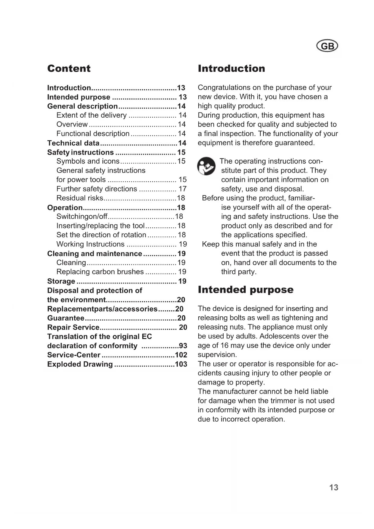 - Introduction Congratulations on the purchase of your new device. With it, you have chosen a high quality product. During production, this equipment has been checked for quality and subjected to a nal inspection. The functionality of your equipment is therefore guaranteed. The operating instructions con- stitute part of this product. They contain important information on safety, use and disposal. Before using the product, familiar- ise yourself with all of the operat- ing and safety instructions. Use the product only as described and for the applications specied. Keep this manual safely and in the event that the product is passed on, hand over all documents to the third party. Intended purpose The device is designed for inserting and releasing bolts as well as tightening and releasing nuts. The appliance must only be used by adults. Adolescents over the age of 16 may use the device only under supervision. The user or operator is responsible for ac- cidents causing injury to other people or damage to property. The manufacturer cannot be held liable for damage when the trimmer is not used in conformity with its intended purpose or due to incorrect operation. Translation of the original EC declaration of conformity p. 93