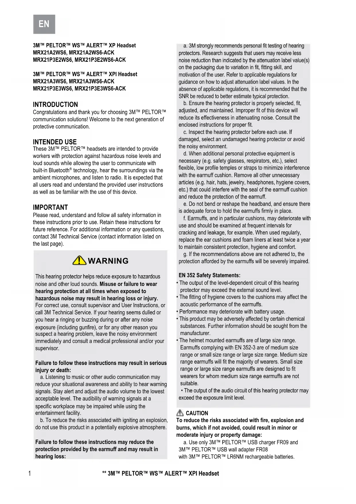 WARNING This hearing protector helps reduce exposure to hazardous noise and other loud sounds. Misuse or failure to wear hearing protection at all times when exposed to hazardous noise may result in hearing loss or injury. For correct use, consult supervisor and User Instructions, orcall 3M Technical Service. If your hearing seems dulled or you hear a ringing or buzzing during or after any noise exposure (including gunre), or for any other reason you suspect a hearing problem, leave the noisy environment immediately and consult a medical professional and/or your supervisor.Failure to follow these instructions may result in serious injury or death:a. Listening to music or other audio communication may reduce your situational awareness and ability to hear warning signals. Stay alert and adjust the audio volume to the lowest acceptable level. The audibility of warning signals at a specic workplace may be impaired while using the entertainment facility.b. To reduce the risks associated with igniting an explosion, do not use this product in a potentially explosive atmosphere.Failure to follow these instructions may reduce the protection provided by the earmuff and may result in hearing loss:a. 3M strongly recommends personal t testing of hearing protectors. Research suggests that users may receive less noise reduction than indicated by the attenuation label value(s) on the packaging due to variation in t, tting skill, and motivation of the user. Refer to applicable regulations for guidance on how to adjust attenuation label values. In the absence of applicable regulations, it is recommended that the SNR be reduced to better estimate typical protection. b. Ensure the hearing protector is properly selected, t, adjusted, and maintained. Improper t of this device will reduce its effectiveness in attenuating noise. Consult the enclosed instructions for proper t.c. Inspect the hearing protector before each use. If damaged, select an undamaged hearing protector or avoid the noisy environment.d. When additional personal protective equipment is necessary (e.g. safety glasses, respirators, etc.), select exible, low prole temples or straps to minimize interference with the earmuff cushion. Remove all other unnecessary articles (e.g. hair, hats, jewelry, headphones, hygiene covers, etc.) that could interfere with the seal of the earmuff cushion and reduce the protection of the earmuff.e. Do not bend or reshape the headband, and ensure there is adequate force to hold the earmuffs rmly in place.f. Earmuffs, and in particular cushions, may deteriorate with use and should be examined at frequent intervals for cracking and leakage, for example. When used regularly, replace the ear cushions and foam liners at least twice a year to maintain consistent protection, hygiene and comfort.g. If the recommendations above are not adhered to, the protection afforded by the earmuffs will be severely impaired.EN 352 Safety Statements:• The output of the level-dependent circuit of this hearing protector may exceed the external sound level.• The tting of hygiene covers to the cushions may affect the acoustic performance of the earmuffs.• Performance may deteriorate with battery usage. • This product may be adversely affected by certain chemical substances. Further information should be sought from the manufacturer.• The helmet mounted earmuffs are of large size range. Earmuffs complying with EN 352-3 are of medium size range or small size range or large size range. Medium size range earmuffs will t the majority of wearers. Small size range or large size range earmuffs are designed to t wearers for whom medium size range earmuffs are not suitable.• The output of the audio circuit of this hearing protector may exceed the exposure limit level.CAUTIONTo reduce the risks associated with re, explosion and burns, which if not avoided, could result in minor or moderate injury or property damage:a. Use only 3M™ PELTOR™ USB charger FR09 and 3M™ PELTOR™ USB wall adapter FR08 with 3M™ PELTOR™ LR6NM rechargeable batteries.
