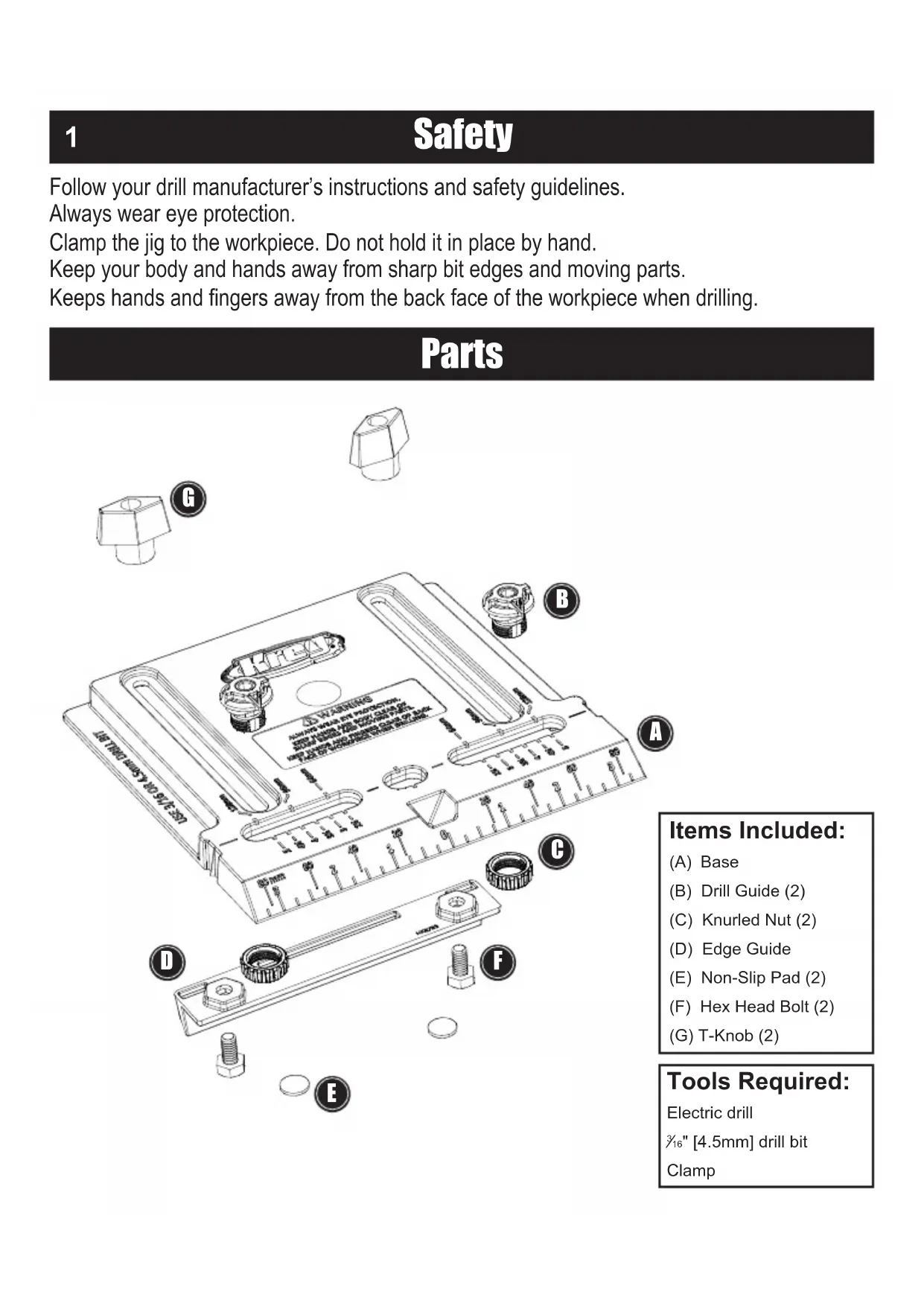 Items Included: (A) Base (B) Drill Guide (2) (C) Knurled Nut (2) (D) Edge Guide (E) Non-Slip Pad (2) (F) Hex Head Bolt (2) (G) T-Knob (2) Tools Required: Electric drill