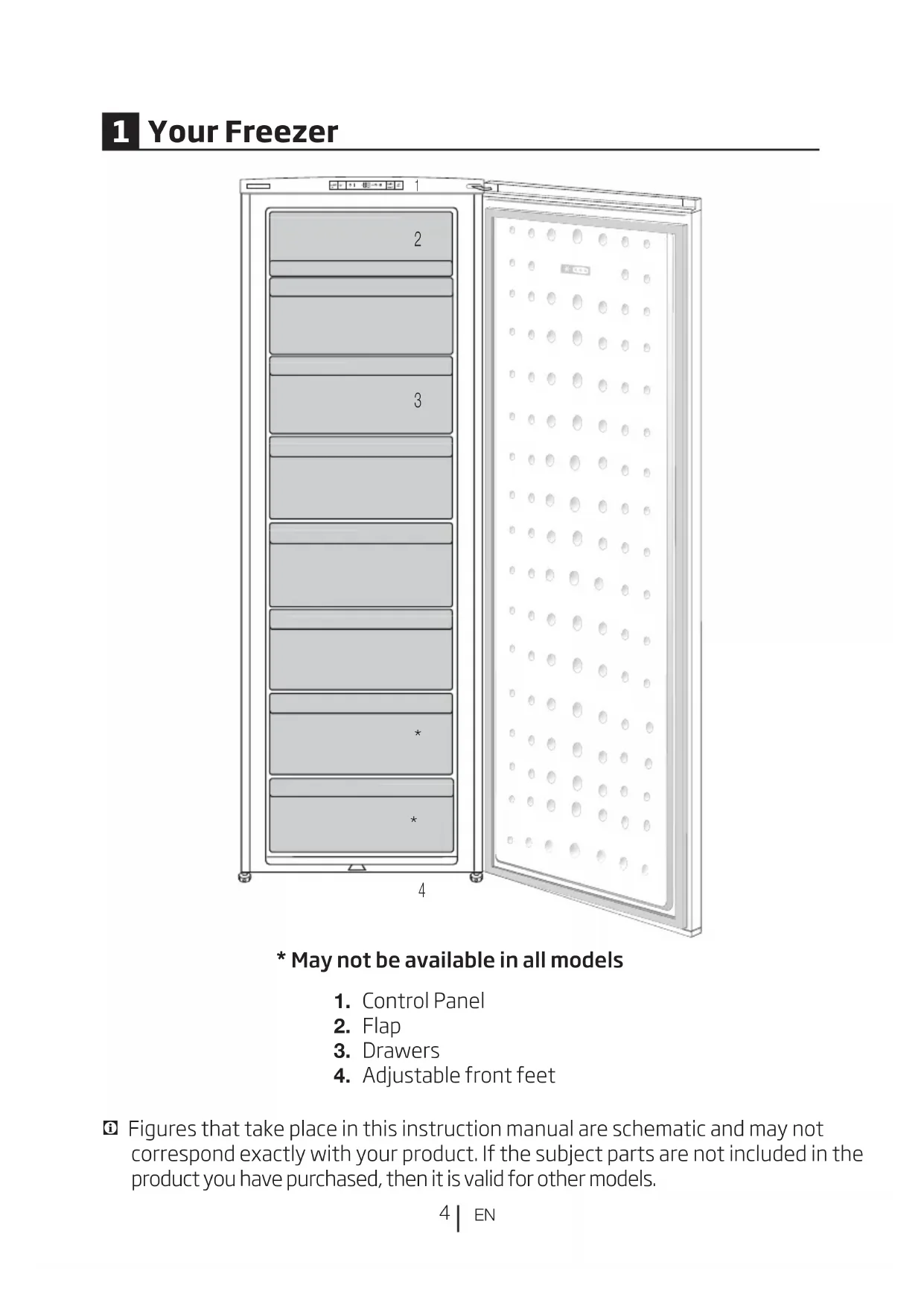 Press this button to activate or deactivate the quick freeze function. When you activate the function, the freezer compartment will be cooled to a temperature lower than the set value. (Quick) To turn on or off the icematic, press and hold it for 3 seconds. C Figures that take place in this instruction manual are schematic and may not correspond exactly with your product. If the subject parts are not included in the product you have purchased, then it is valid for other models.