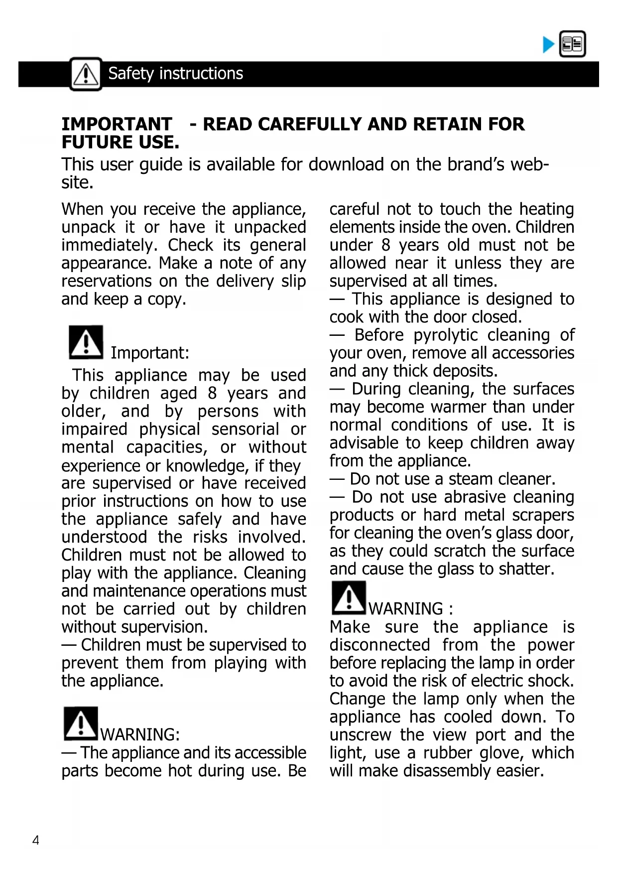 — The appliance and its accessible parts become hot during use. Be careful not to touch the heating elements inside the oven. Children under 8 years old must not be allowed near it unless they are supervised at all times. — This appliance is designed to cook with the door closed. — Before pyrolytic cleaning of your oven, remove all accessories and any thick deposits. — During cleaning, the surfaces may become warmer than under normal conditions of use. It is advisable to keep children away from the appliance. — Do not use a steam cleaner. — Do not use abrasive cleaning products or hard metal scrapers for cleaning the oven’s glass door, as they could scratch the surface and cause the glass to shatter.
